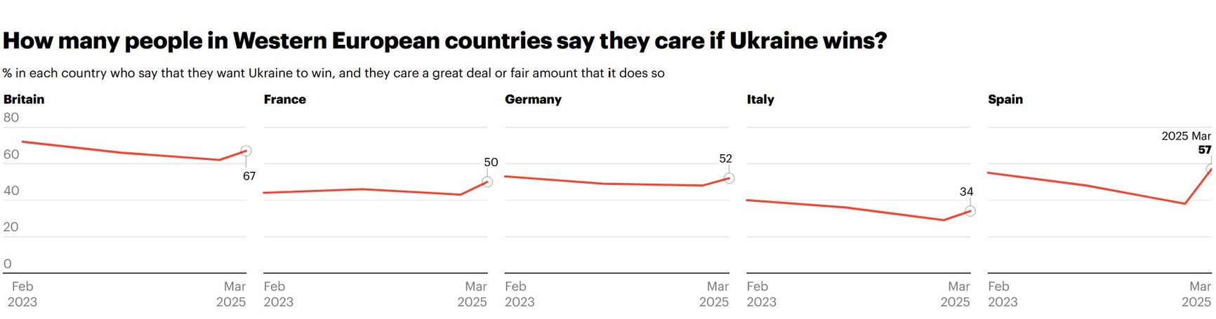 Теперь рассмотрим результаты опроса YouGov об отношении к войне в Украине, проведенного в том же 1-м квартале 2025 года параллельно в Великобритании, Испании, Италии и Франции. Из этих стран Британия оказалась самой проукраинской. Вот ответы на вопрос о популярности в этих странах Зеленского, Трампа и Путина: