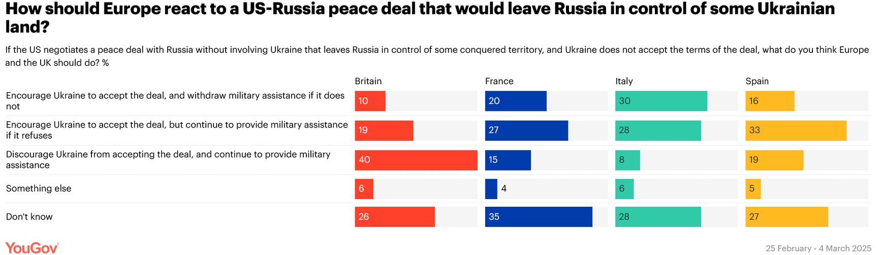 А это результаты опроса о том, как Европе следует поступать, если США и Россия без участия Украины достигнут договоренности, по которой Россия сохранит контроль над частью украинской территории. Варианты ответа: