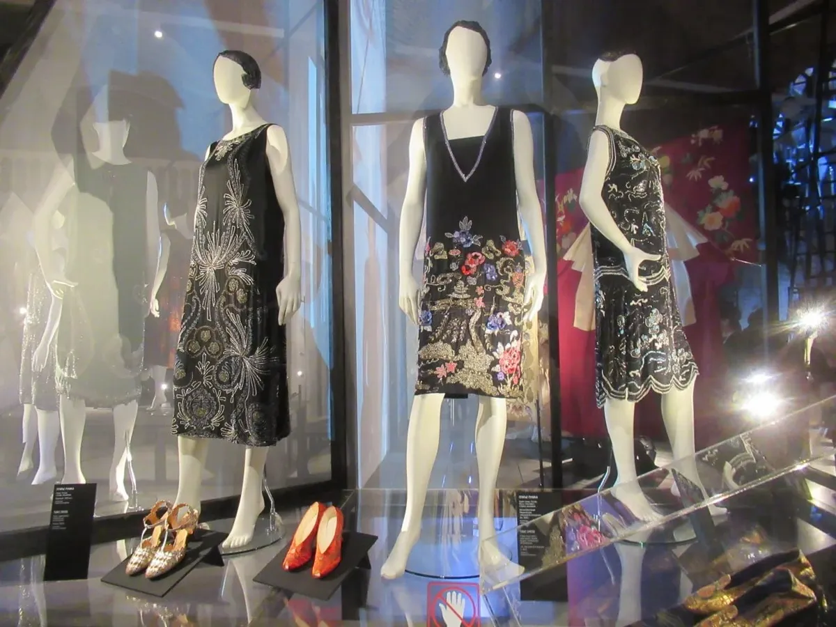 В полумраке главные предметы экспонирования — платья, туфли, аксессуары — смотрятся особенно выигрышно. Знаменитые бисерные платья, похожие на ярких тропических бабочек, переливаются в свете направленных на них софитов. На выставке представлены наряды от самых известных модельеров Европы и Америки — Жанны Ланвен, Поля Пуаре, Эдварда Молино, Люсьена Лелонга, Мариано Фортуни. Фортуни — настоящая легенда дизайна начала XX века: его шелковые плиссированные туники «дельфосы» стали настоящими хитами еще до Первой мировой и остались на вершине моды до конца 30-х годов. В Эрмитаже показаны два его платья, шелковое и бархатное, вместе с туфлями, выполненными из тех же материалов.