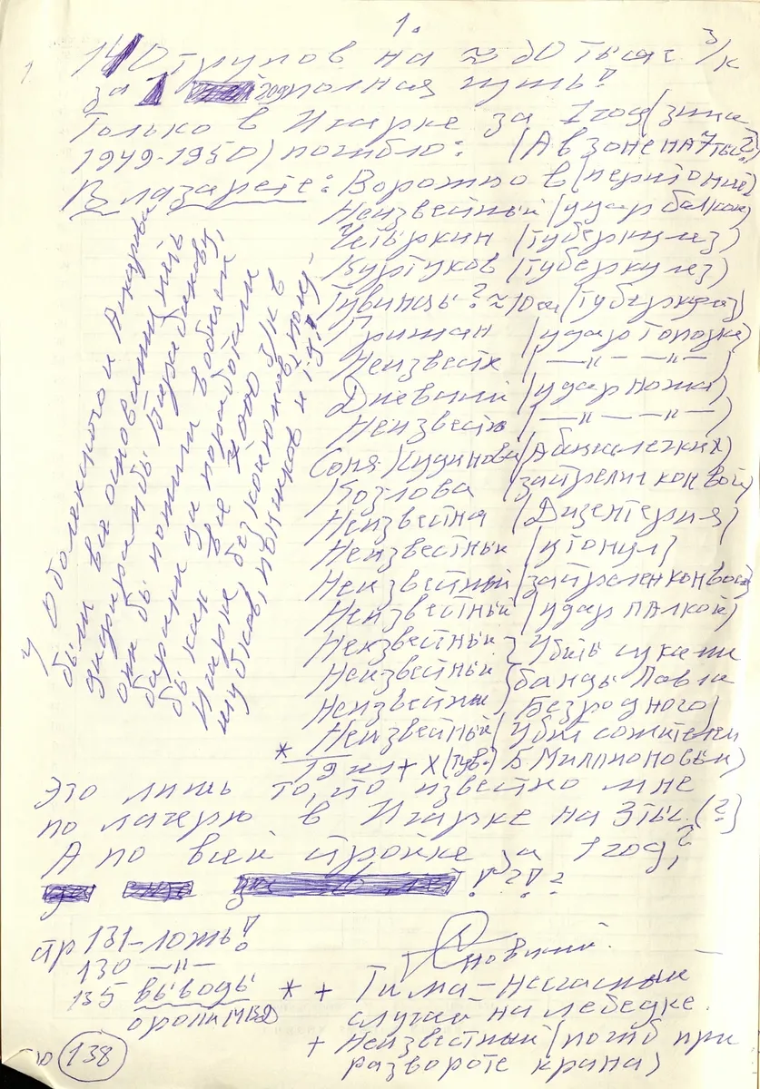 Не нужны такие стройки никому. Сколько людей погибло на них. Были у лагерей кладбища. К ноге бирка привязывалась, хоронили из морга. А поверх ничего не писали — кто там захоронен. Но хоронили не всех. Бывало, в лес идем, сколотим брус и тащим на себе. В лесу, когда идешь: то убитый, то застреленный (лежит). Самоохранники были из числа зэков, они шестерок, других неугодных пристреливали, к дереву привязывали. Шестерки — те, кто угождал блатным.