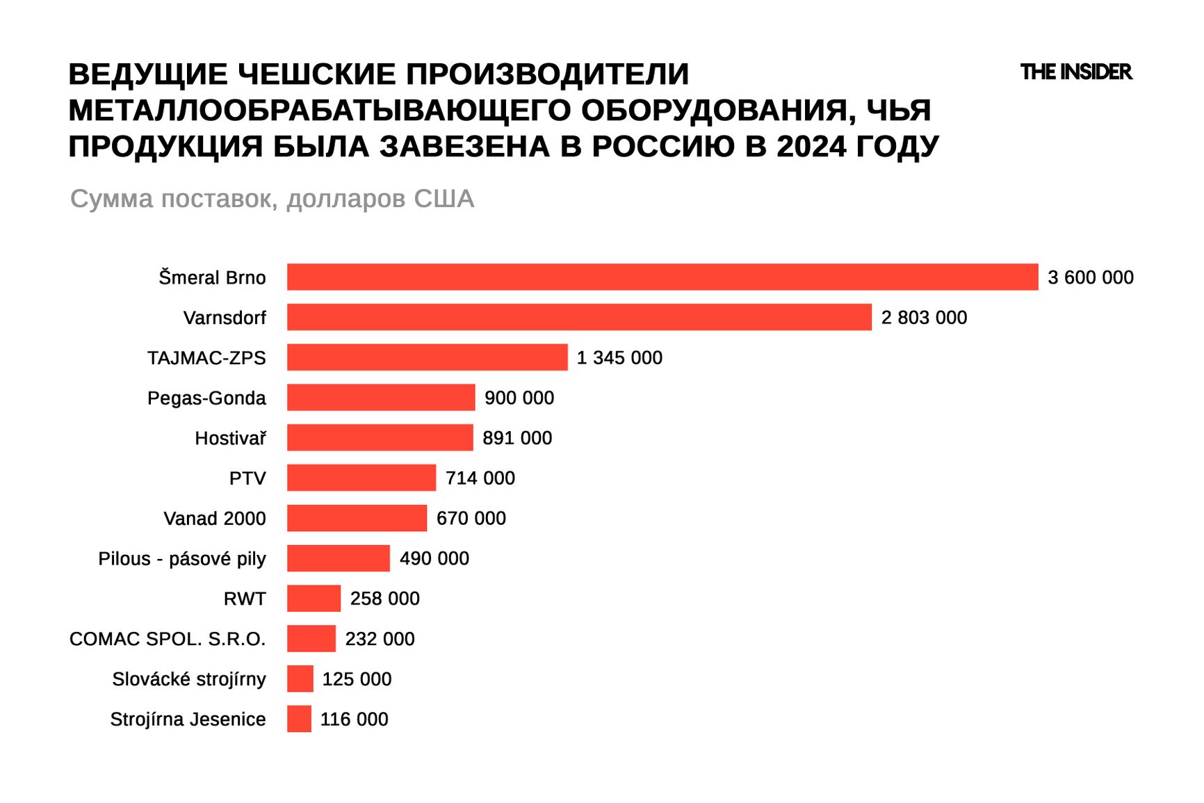 Кроме того, The Insider установил пять чешских компаний, которые непосредственно поставляли металлообрабатывающее оборудование, востребованное в ВПК и энергетике, в 2023–2024 годах.