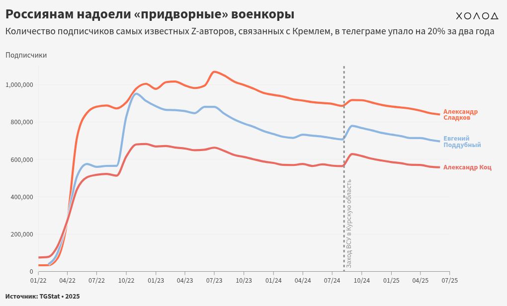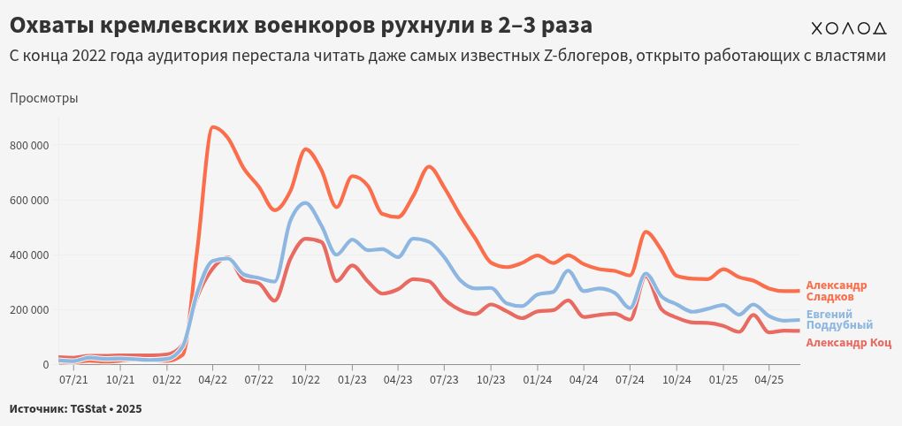 Но рост их аудитории закончился в середине 2023 года, и в последние два года количество их подписчиков стремительно сокращалось. По подсчетам «Холода», аудитория пропагандиста и военкора «Комсомольской правды» Александра Коца росла до конца 2022 года. На пике популярности в ноябре 2022 года его канал насчитывал 690780 подписчиков, однако в последующие месяцы их количество стабильно падало. С 1 декабря 2022 по 1 июня 2025 года Коц потерял примерно 18,3% аудитории (с 682880 до 558154 подписчиков).