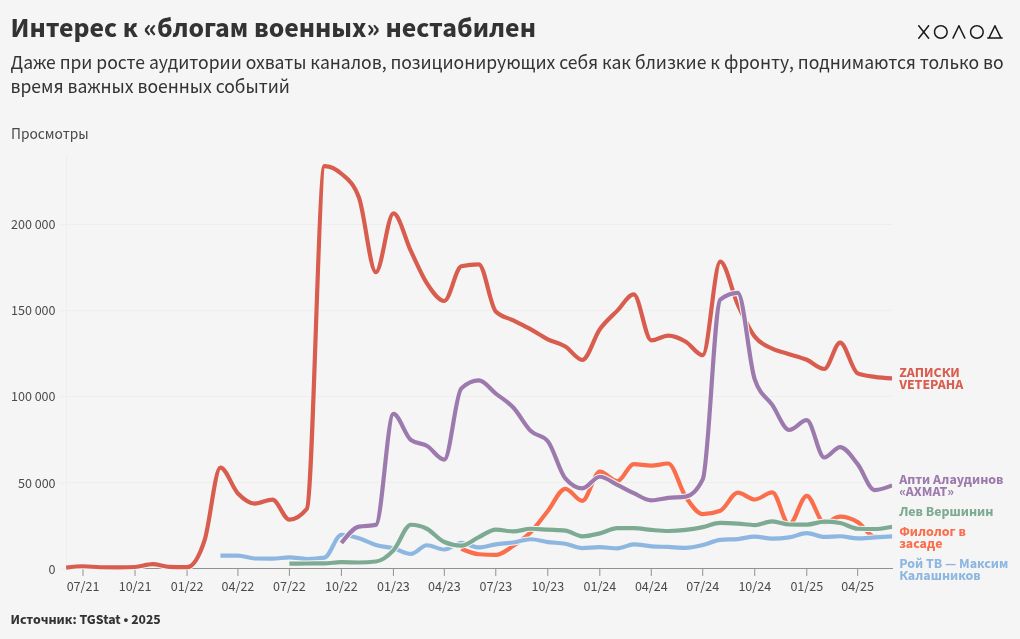 Правда, охваты публикаций у этих «фронтовых блогеров» показывают неоднородную картину: если одни каналы — например, «Рой TV» и «Лев Вершинин» — стабильно растут по просмотрам, то «Филолог в засаде» или «Zаписки Ветерана» уже прошли пиковые значения и сейчас поддерживают показатели в два-три раза ниже максимумов: в самом крупном из них, «Zаписках ветерана», каждый пост в среднем читает чуть более 100 тысяч человек.