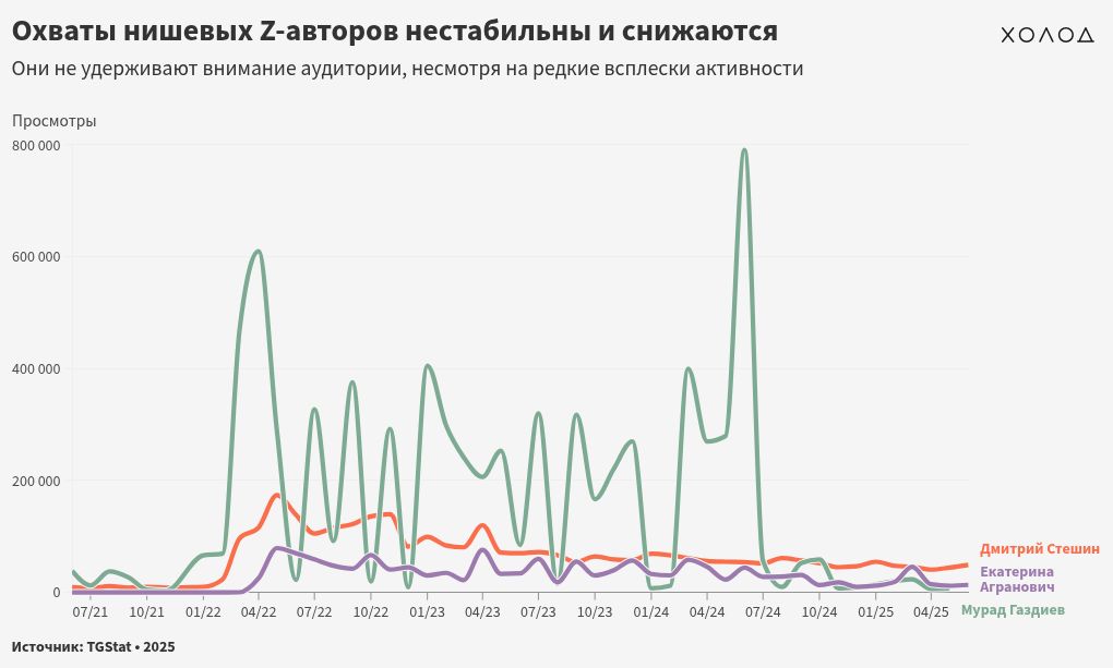 Более нишевые военкоры тоже стремительно теряют аудиторию. Количество подписчиков «придворной» Екатерины Агранович росло до апреля 2023 года и на пике составило 81525 подписчиков. В последующие месяцы оно упало на 43,24% и на 1 июня 2025 года составило 46273 пользователя. Корреспондент «Комсомольской правды» Дмитрий Стешин за 2022 год набрал 187808 подписчиков, но в следующие два с половиной года потерял 23,5% аудитории, которая снизилась до 143597 подписчиков. А военкор Russia Today Мурад Газдиев с пика популярности в мае 2023 года на отметке в 43159 подписчиков потерял 35% аудитории — 1 июня 2025 на него было подписано 27999 пользователей.Число их подписчиков уже не растет даже во время важных событий вроде освобождения Курской области или переговоров в Стамбуле.