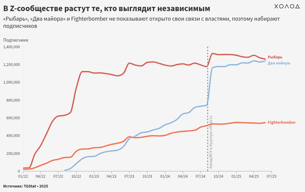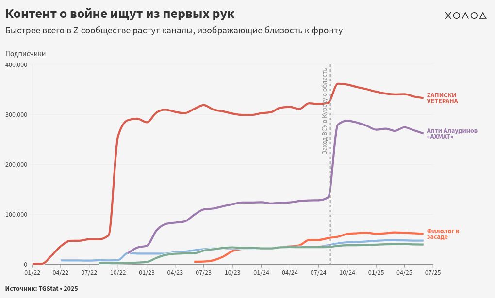 По подсчетам «Холода», за последний год некоторые провоенные авторы потеряли до 30% своей аудитории, а за два года количество подписчиков у отдельных каналов упало почти вдвое. Интерес к «Z-сообществу» стремительно снижается, и даже небольшой всплеск на фоне событий августа 2024 года, когда украинские военные взяли под контроль территории Курской области, не изменил эту тенденцию.