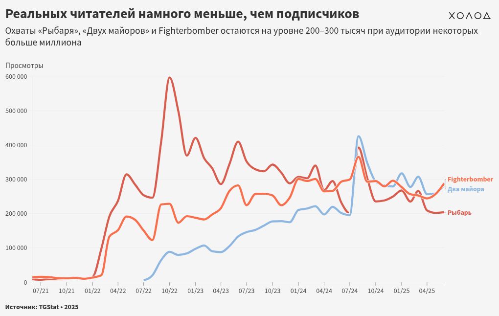 Так, аудитория канала «Рыбарь» за последний год выросла на 3,61% и к 1 июня 2025 года составила 1259549 подписчиков (но при охватах лишь в 200 тысяч просмотров на пост). «Два майора» увеличили аудиторию на 73,61%, доведя ее до 1241573 пользователей (хотя охват отдельных публикаций составляет около 250 тысяч), а канал Fighterbomber прибавил 19,34% и к 1 июня достиг отметки в 548029 подписчиков (его посты просматривает почти половина подписчиков — примерно 260 тысяч).