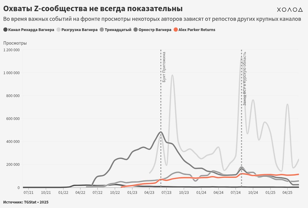 «Оркестр Вагнера», например, стартовал со скромных 20 тысяч просмотров на пост в июне 2022 года, но во время бунта Пригожина в июне 2023 года достиг пика в 482971 просмотр. После этого началось стремительное падение: к апрелю-июню 2024 года охваты упали до уровня 106–115 тысяч, а к 2025 году и вовсе рухнули до 24–71 тысячи просмотров.