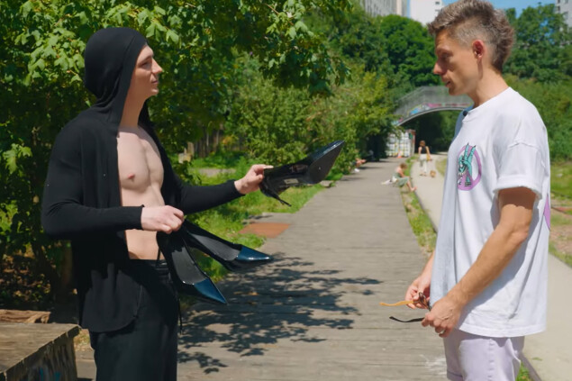 Юрий Дудь и пришедший на «голую вечеринку» в одном носке Vacío пробежались на каблуках