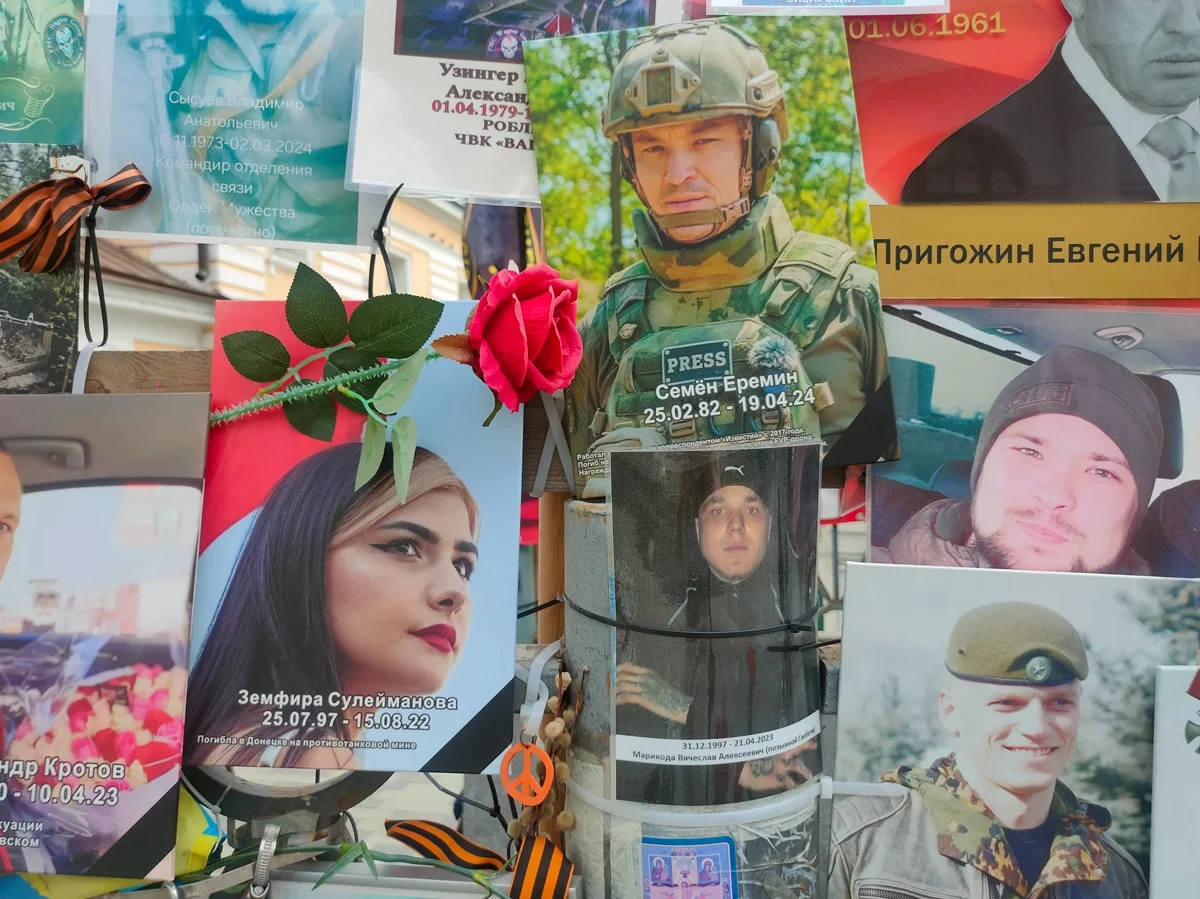 Если приглядеться, то среди фотографий погибших можно увидеть брелок с пацифистским символом, недалеко от фотографии Пригожина.