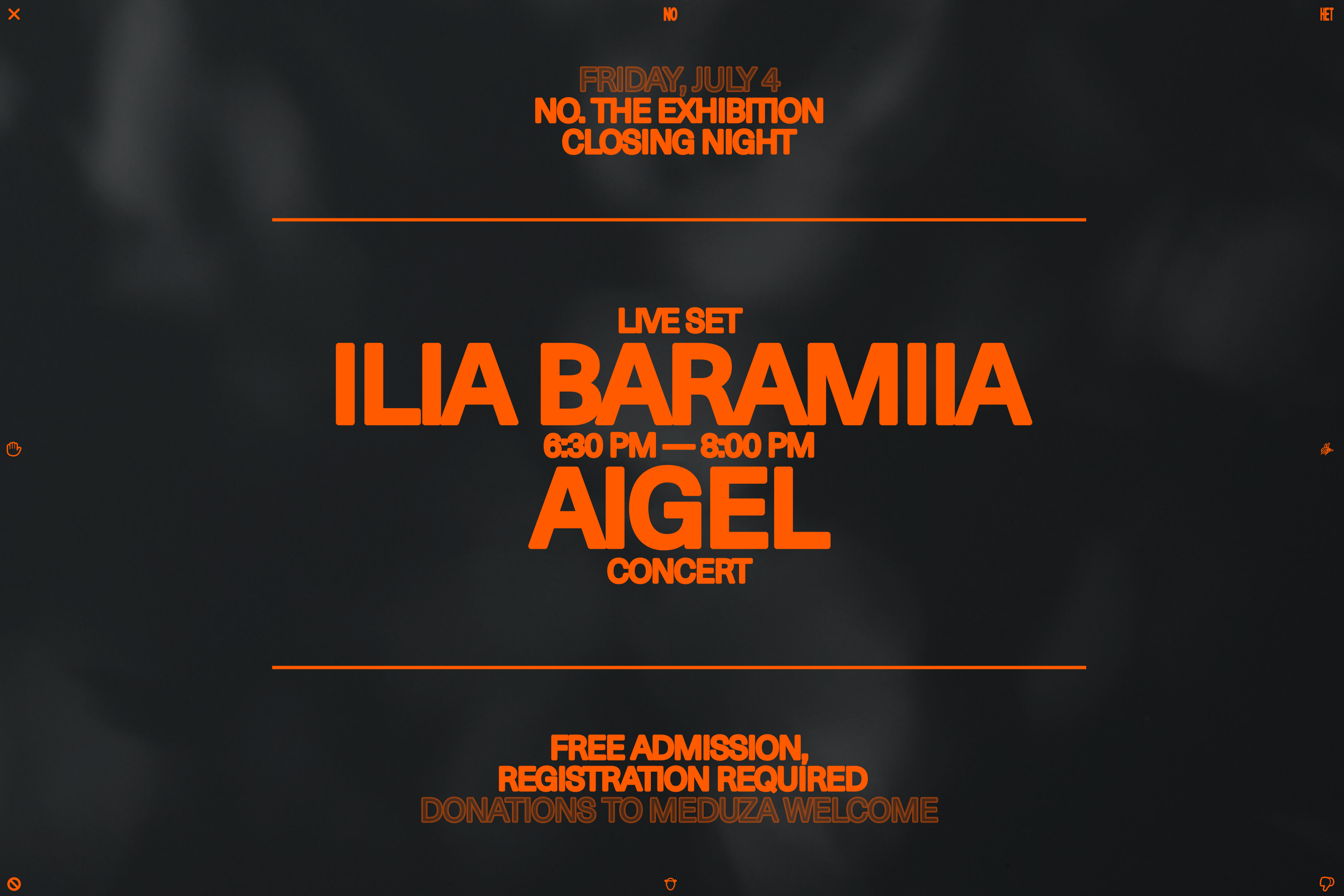 Выставка «No» работает в день концерта с 10:00 до 22:00 (в остальные дни с 10:00 до 20:00). И еще раз напоминаем, что ее можно будет посмотреть до 6 июля включительно. В последние выходные выставки пройдут финальные кураторские экскурсии — на них тоже нужно зарегистрироваться. Вход на выставку бесплатный.
