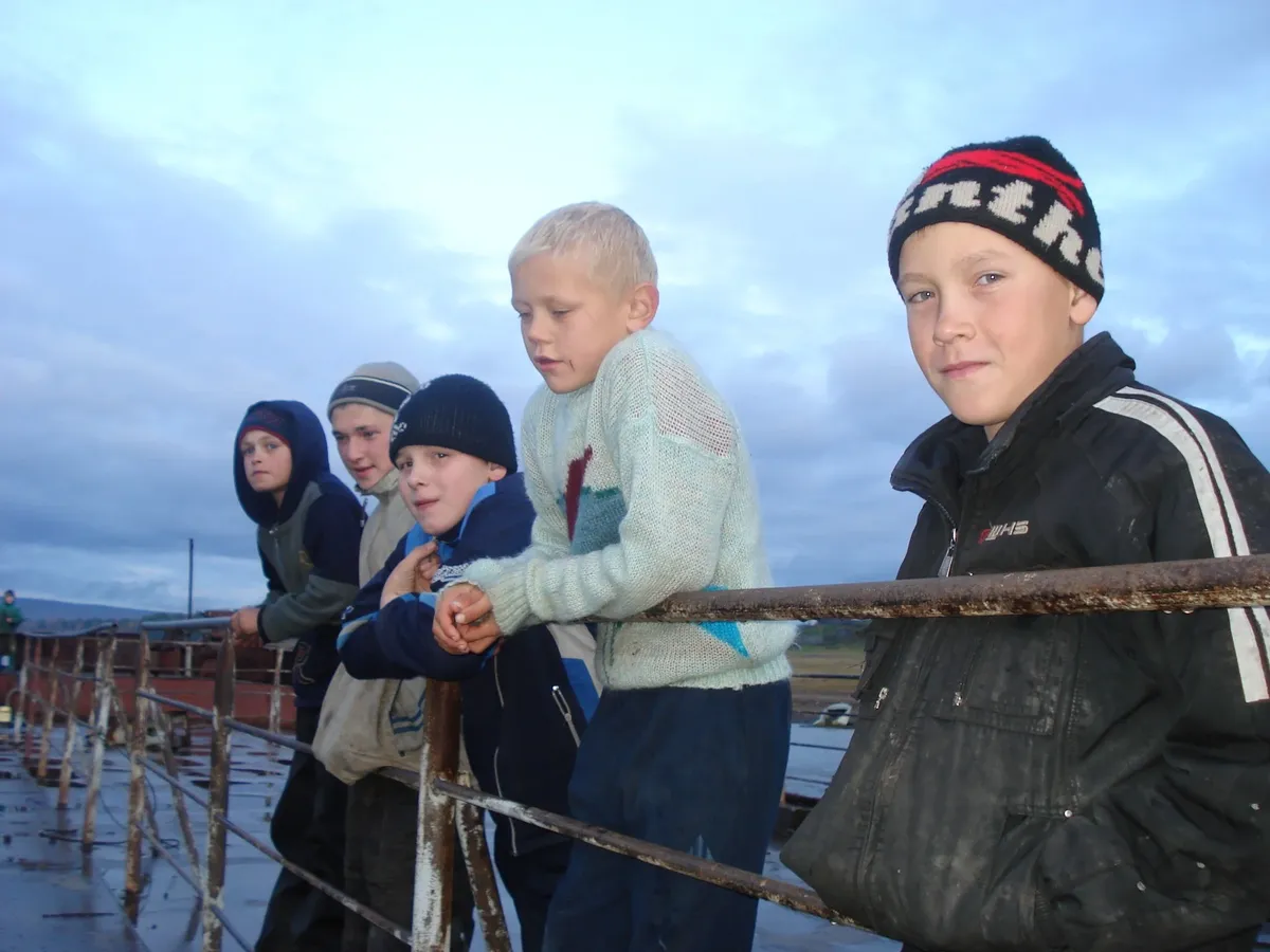 Пока не кончается дорога — на машинах. Далее на катере. Несколько б.н.п. (см. сноску 1) и еще теплящихся деревень на пути. Тут фоткал почти исключительно детей. Думаю, это не столько ясное понимание их будущего, сколько self-help-терапия: ну не завалившиеся же заборы и следы техноканнибализма запечатлевать — все эти скелеты баркасов, машин, вертолетов, всю эту прежнюю организованную материю, раздербаненную ныне. Дети все же посложнее сквозняков, заполнивших тут пустоты. Дети да собаки.
