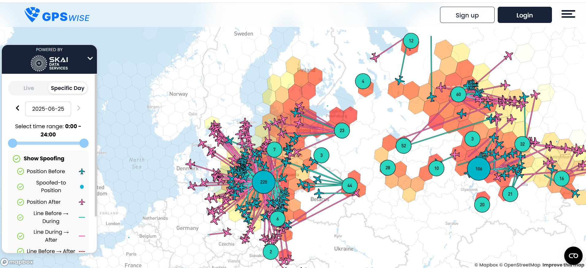 Спуфинг можно отслеживать с помощью общедоступных приложений и сервисов. За 25 июня 2025 года на западной границе России был зафиксирован очередной пик GNSS-спуфинга: только в районе Калининградской области платформа GPSWise зарегистрировала 220 инцидентов подмены навигационных координат (днем ранее – 180). От спуфинга пострадали рейсы, проходившие над Польшей, Литвой, Германией, Латвией и Беларусью – их навигационные системы на короткое время "переносились" на десятки километров от реального положения, прежде чем восстанавливались. Дополнительные всплески зафиксированы вблизи Санкт-Петербурга (23 случая), на границе с Эстонией и в небе над Смоленской областью (60). Системность атак, их плотность и география указывают на масштабное и намеренное применение РЭБ-комплексов вдоль всего периметра западной границы.