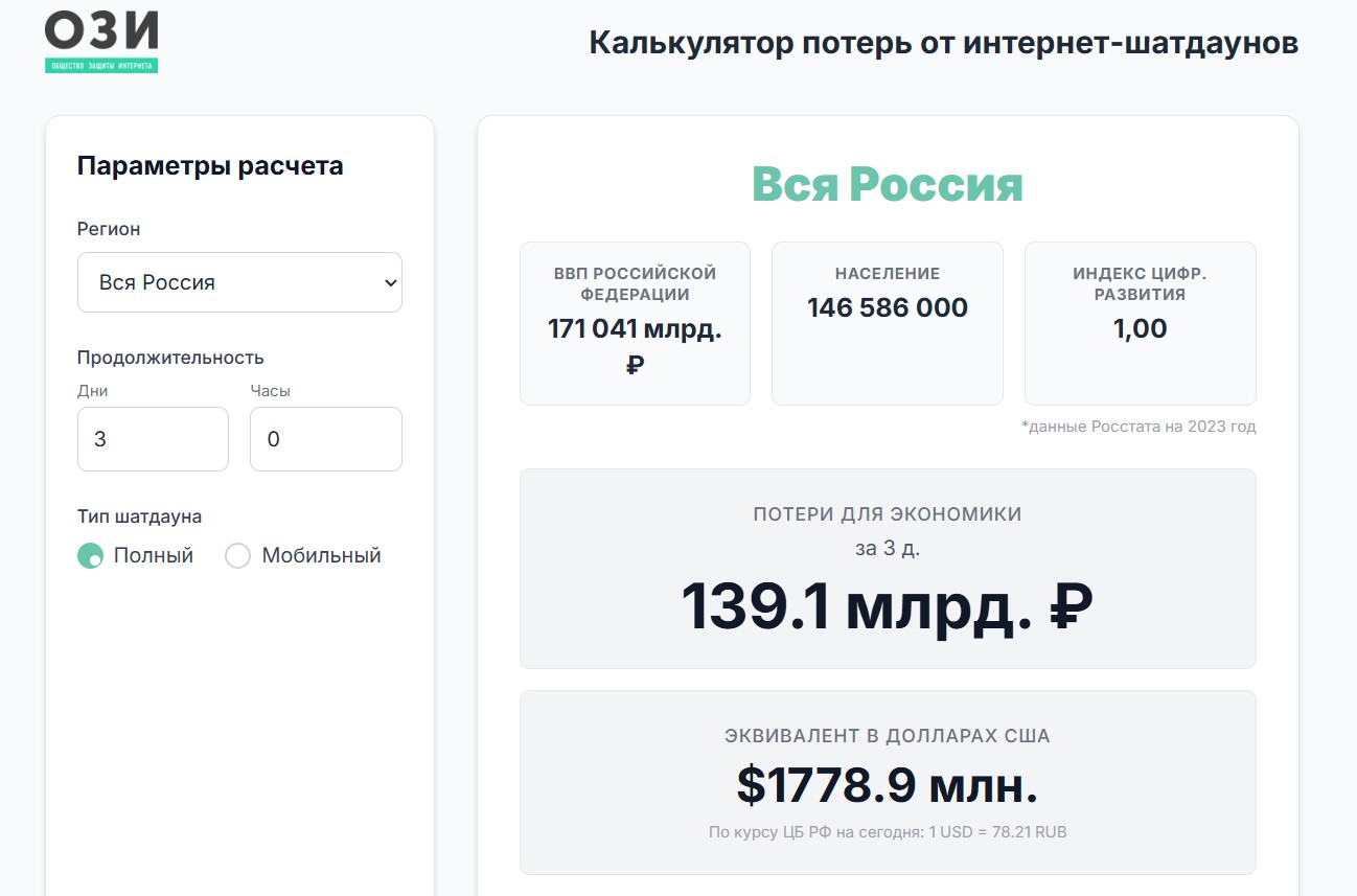 В Псковской области один час мобильного шатдауна стоит 2 млн рублей. Если отрубить и проводной интернет – 3,9 млн рублей. Один день без мобильного интернета – это 47 миллионов убытков. В Ленинградской области один день мобильного шатдауна стоит уже 238,3 млн рублей, в Санкт-Петербурге – почти два миллиарда.