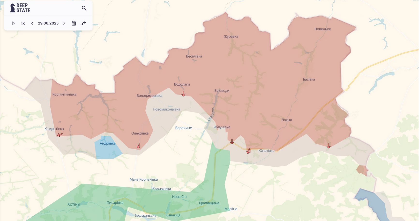 Примерно это же подтверждает карта военных действий DeepState Map, на которой, впрочем, можно разглядеть незначительное продвижение российских войск в районе Юнаковки. Кремлевская пресса, правда, еще 24 мая сообщала, что российская армия вошла в это село, но контроль над ним так и не установлен, что признают и российские СМИ.