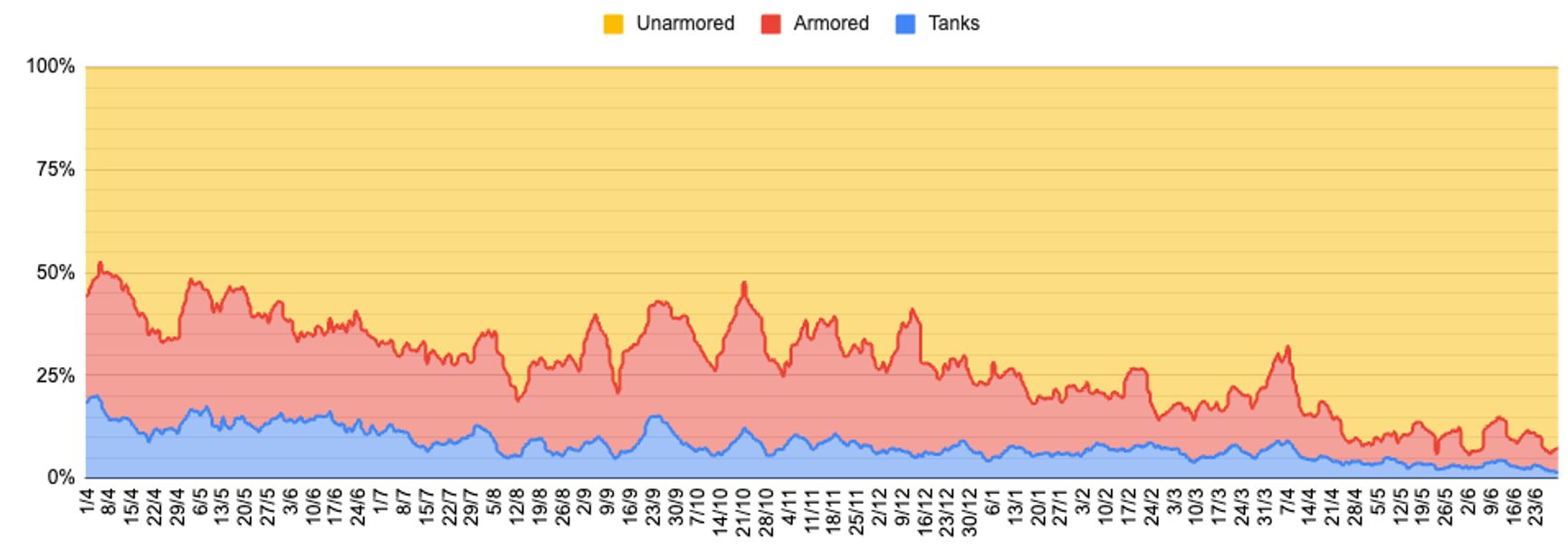Исследователь под ником Vitaly составил инфографику соотношения потерь российских танков, ББМ и небронированной техники на основе данных Генштаба ВСУ. В настоящее время на танки приходится всего 1,5% потерь, еще 5,7% составляют ББМ, остальные 92,8% — багги, мотоциклы, квадроциклы и тому подобная небронированная техника.
