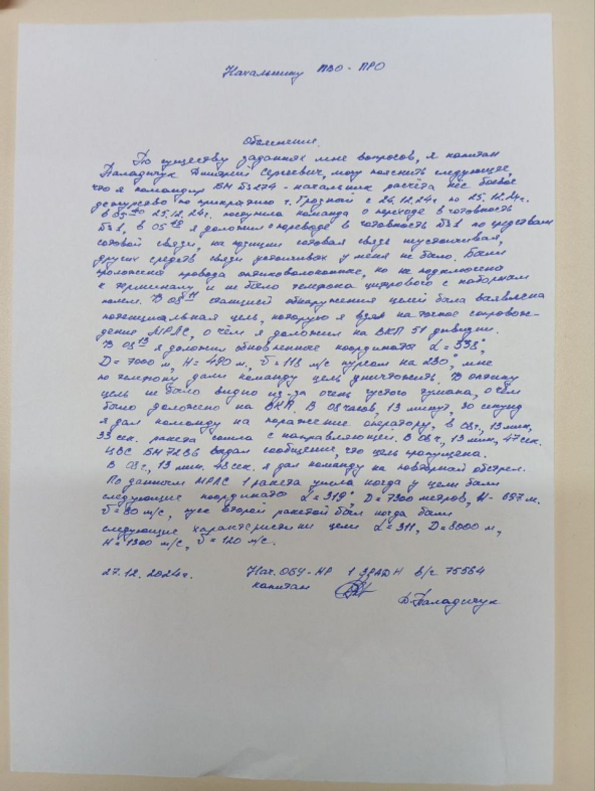 «По существу заданных мне вопросов я, капитан Паладичук Дмитрий Сергеевич, могу пояснить следующее: я — командир БМ № 274, начальник расчета, нес боевое дежурство по прикрытию г. Грозный с 24.12.24 по 25.12.24 года. В 05:40 25.12.24 г. поступила команда о переходе в готовность № 1. В 05:48 я доложил о переходе в готовность № 1 по средствам сотовой связи. На позиции сотовая связь неустойчивая, других устойчивых средств связи у меня не было. Были проложены провода оптоволоконные, но не подключены к терминалу, и не было цифрового телефона с наборным полем.