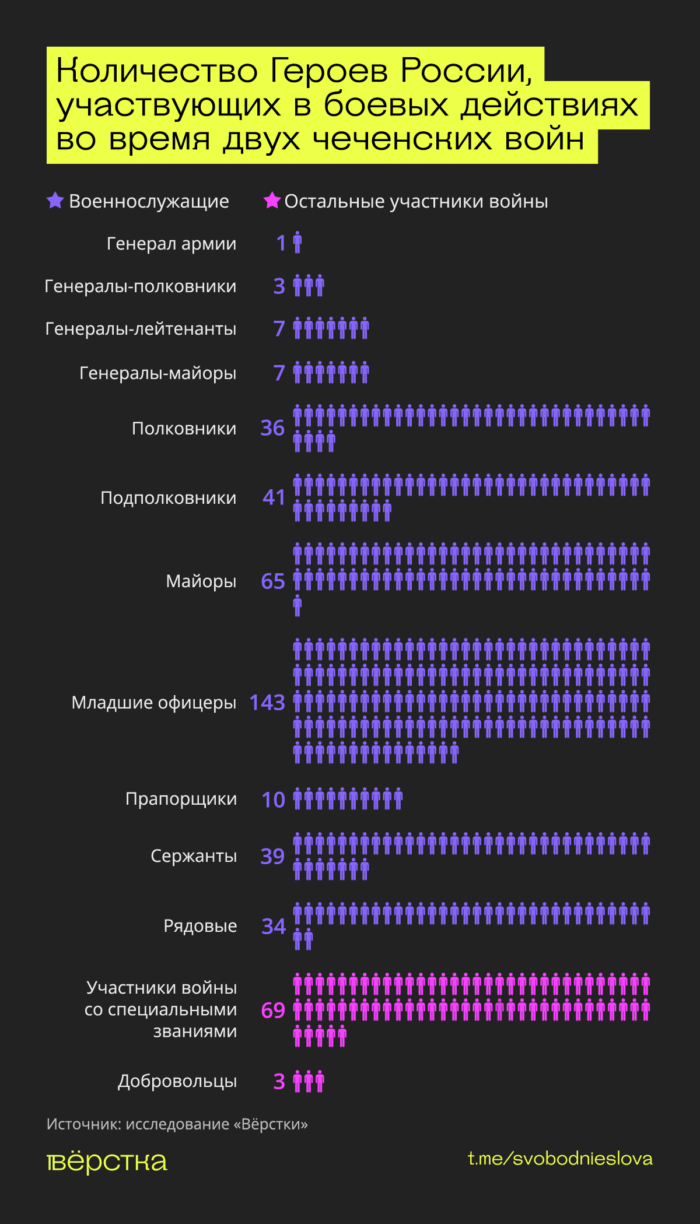 Развернуть↓Согласно исследованию «Вёрстки», более трети военнослужащих, удостоенных звания Героя России во время обеих чеченских войн, составляли младшие офицеры (37 %). Почти пятую часть награждённых (17 %) составляли майоры. Далее следуют подполковники и сержанты — на каждую из этих категорий приходится более 10 %.