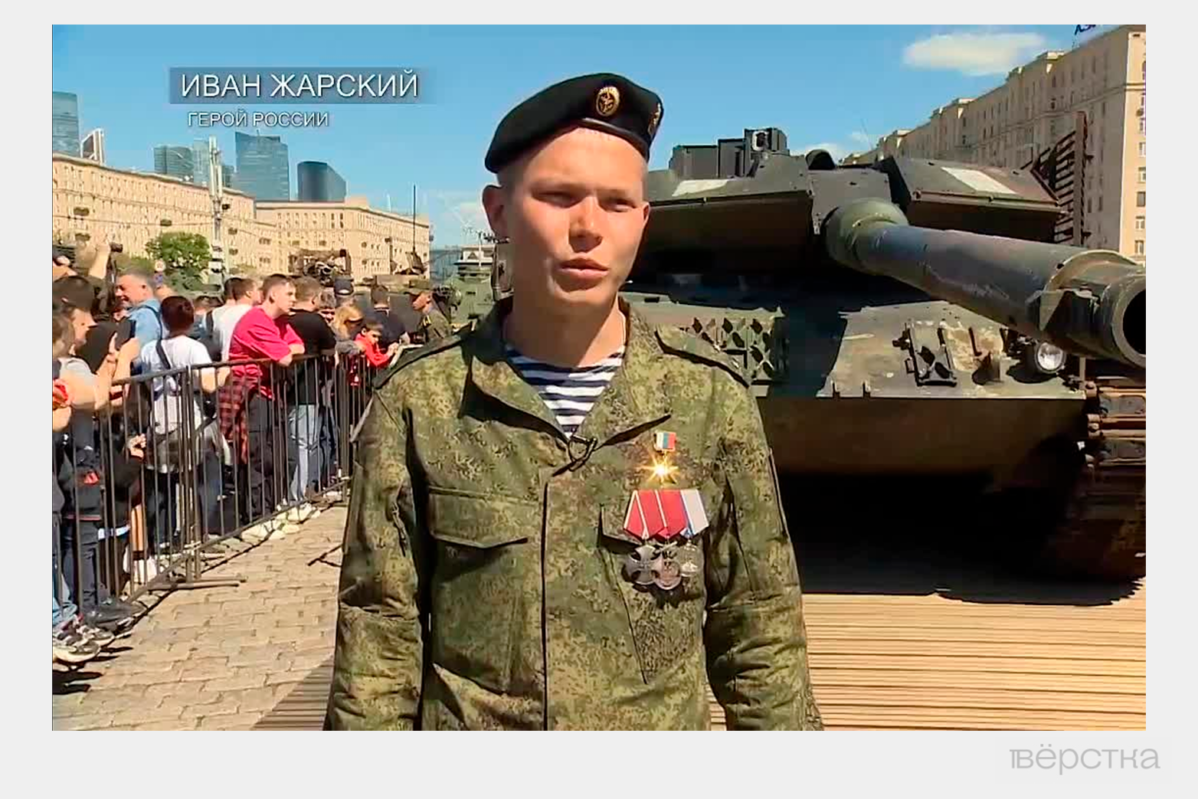 На ещё одном виральном видео с новым Героем России — старший лейтенант Иван Жарский. «Я на компьютере бумажки печатал, потом в столовую перевели», — шутит молодой парень с «Золотой Звездой» на груди возле подбитого немецкого танка, выставленного на трофейной выставке в Москве. Жарский начинал свою военную карьеру ещё кадетом. В 2023 году 27-летний военный получил Героя России за то, что его подразделение за сутки уничтожило восемь единиц техники ВСУ, в том числе иностранную, а также личный состав и опорный пункт украинцев.