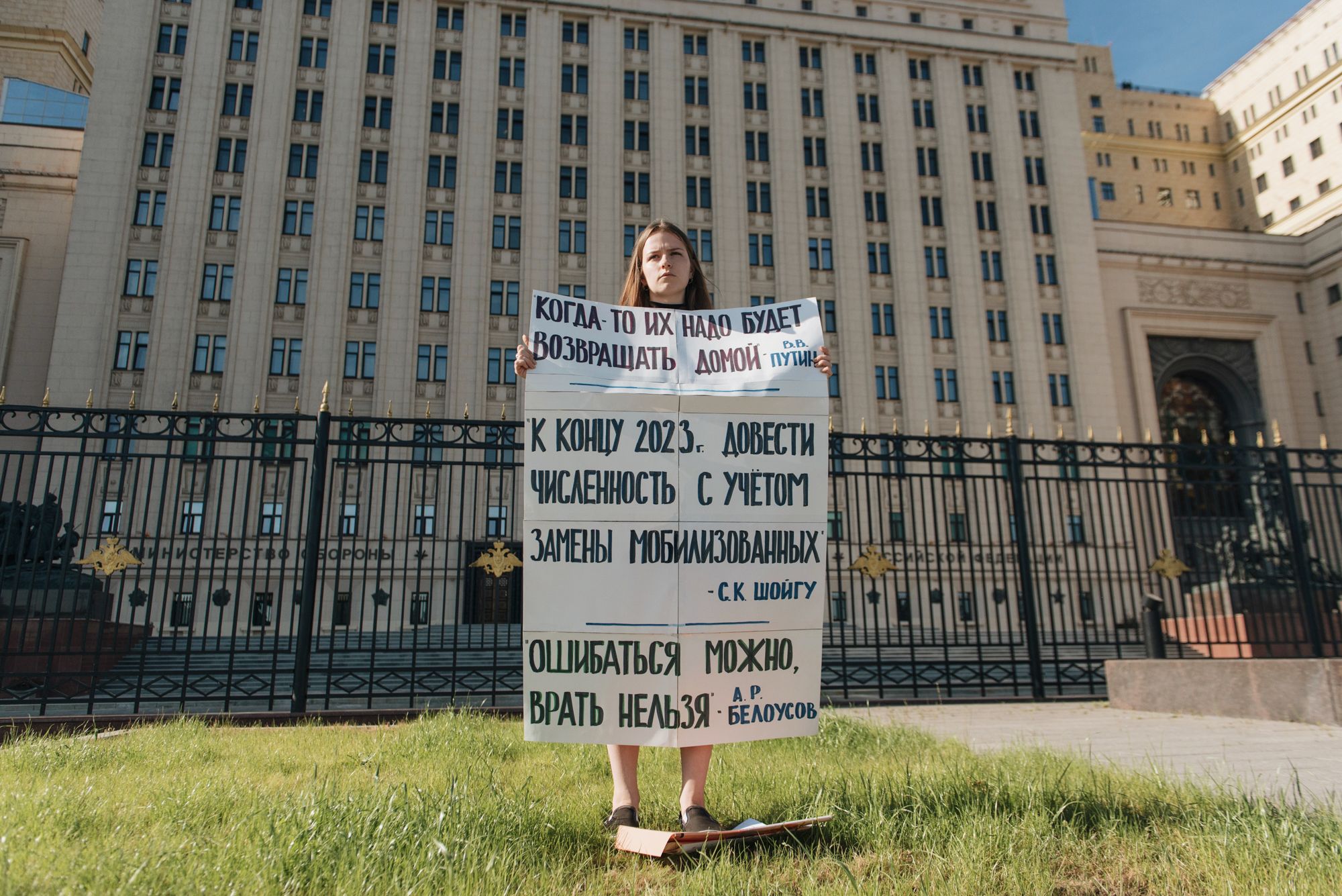 В 2022 году молодой человек Марии Семеновой ушел на фронт. Во вторую годовщину мобилизации, 21 сентября прошлого года, она и еще несколько женщин — подруг, жен и сестер военных из разных регионов страны — собрались на Фрунзенской набережной в Москве. Там, держа в руках плакаты, они пикетировали здание министерства обороны и требовали демобилизации.