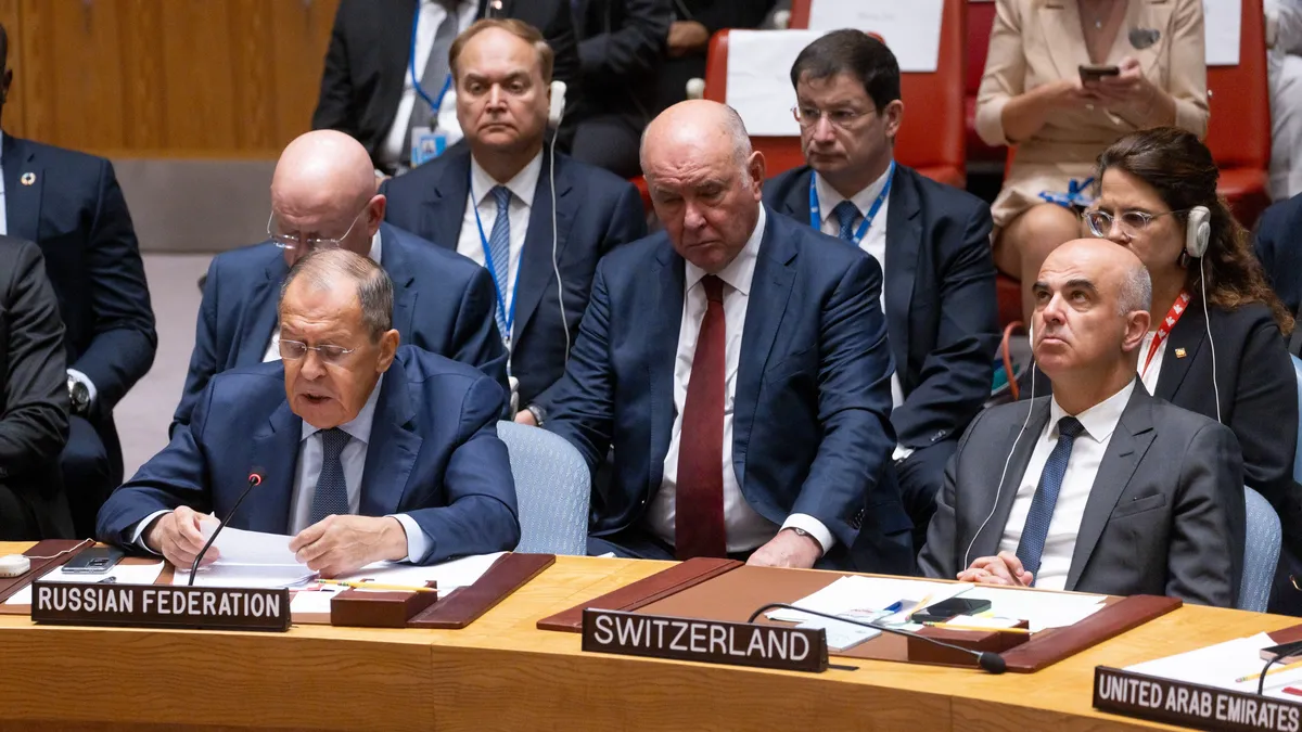 Russia’s Foreign Minister Sergey Lavrov speaks as Switzerland’s President Alain Berset listens during a UN Security Council meeting in New York, 20 September 2023. EPA-EFE/JUSTIN LANE