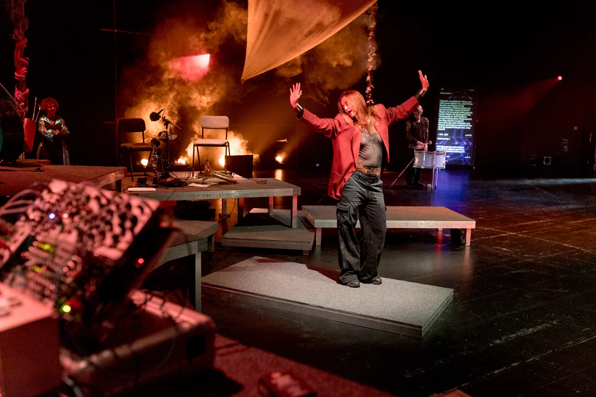 «Wagner Weltweit» — это не классическая опера, а мультижанровый спектакль, который объединяет театр, музыку, видео и перформанс. В нём задействованы два актера и четыре музыканта. Линейного сюжета здесь нет: действие строится как последовательность отдельных эпизодов. Актеры исполняют роли журналиста из Центральной Африки и российского пропагандиста, собравшего в себе черты Дмитрия Киселёва, Евгения Пригожина и Дмитрия Уткина. В их репликах сочетаются реальные цитаты и вымышленные монологи, в том числе звучит знаменитое высказывание Пригожина «Где боеприпасы, суки?» Периодически исполняются арии из «Кольца Нибелунга», используются переработанные вагнеровские мотивы и электронная музыка. Фиксированной партитуры тоже нет, звуковое оформление создается в реальном времени, всего в спектакле используется 27 переработанных тем Рихарда Вагнера. Сцена напоминает одновременно и телестудию, и волшебный лес, оформлена канатами и большим треугольным экраном для проекций, на которых появляются мемы, кадры войны и тексты из соцсетей. В итоге всё складывается в один большой коллаж о войне, пропаганде и власти.