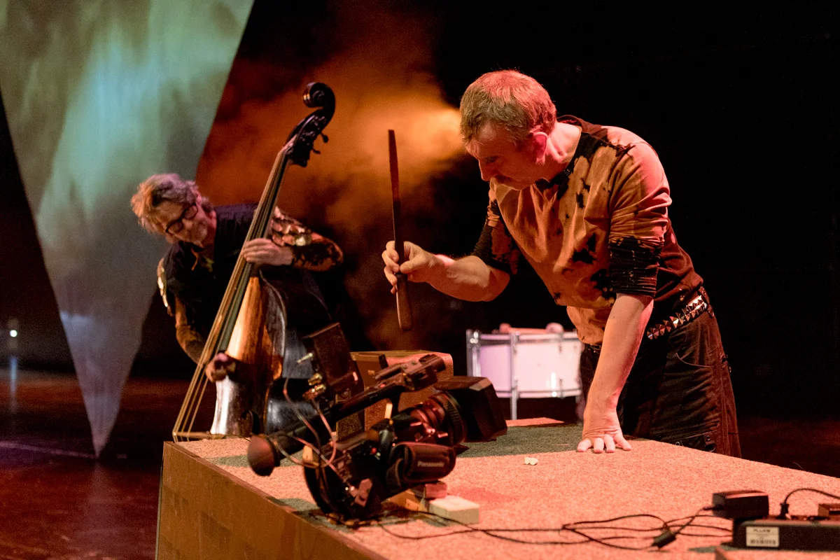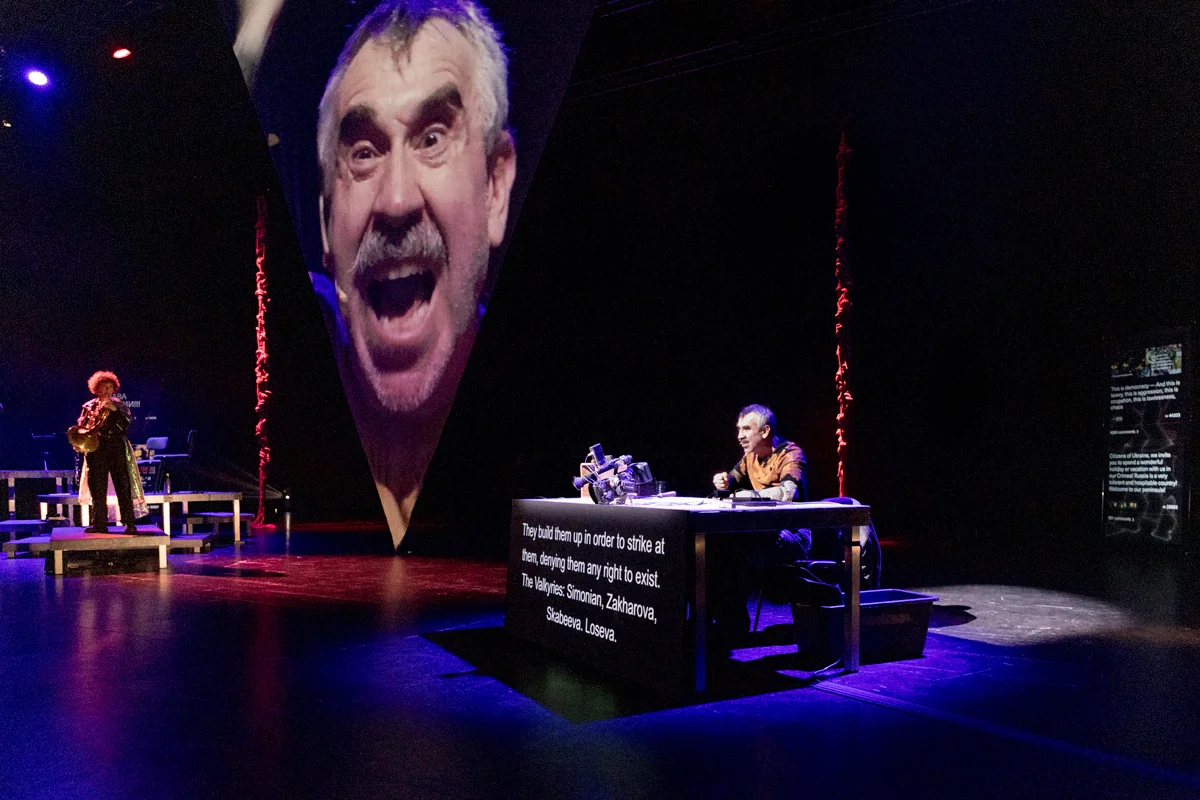 Сценография тоже лаконичная и мрачная: массивная треугольная конструкция рассекает сцену, а проекции кадров из Украины, Центральноафриканской Республики и Сирии перемежаются с лозунгами и мемами из соцсетей. В том числе и на русском мате.