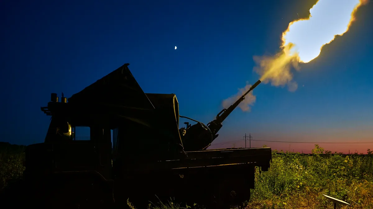 A Ukrainian anti-drone mobile fire team shoots at a Russian drone flying towards Kharkiv, Ukraine, 2 July 2025. Photo: EPA / SERGEY KOZLO