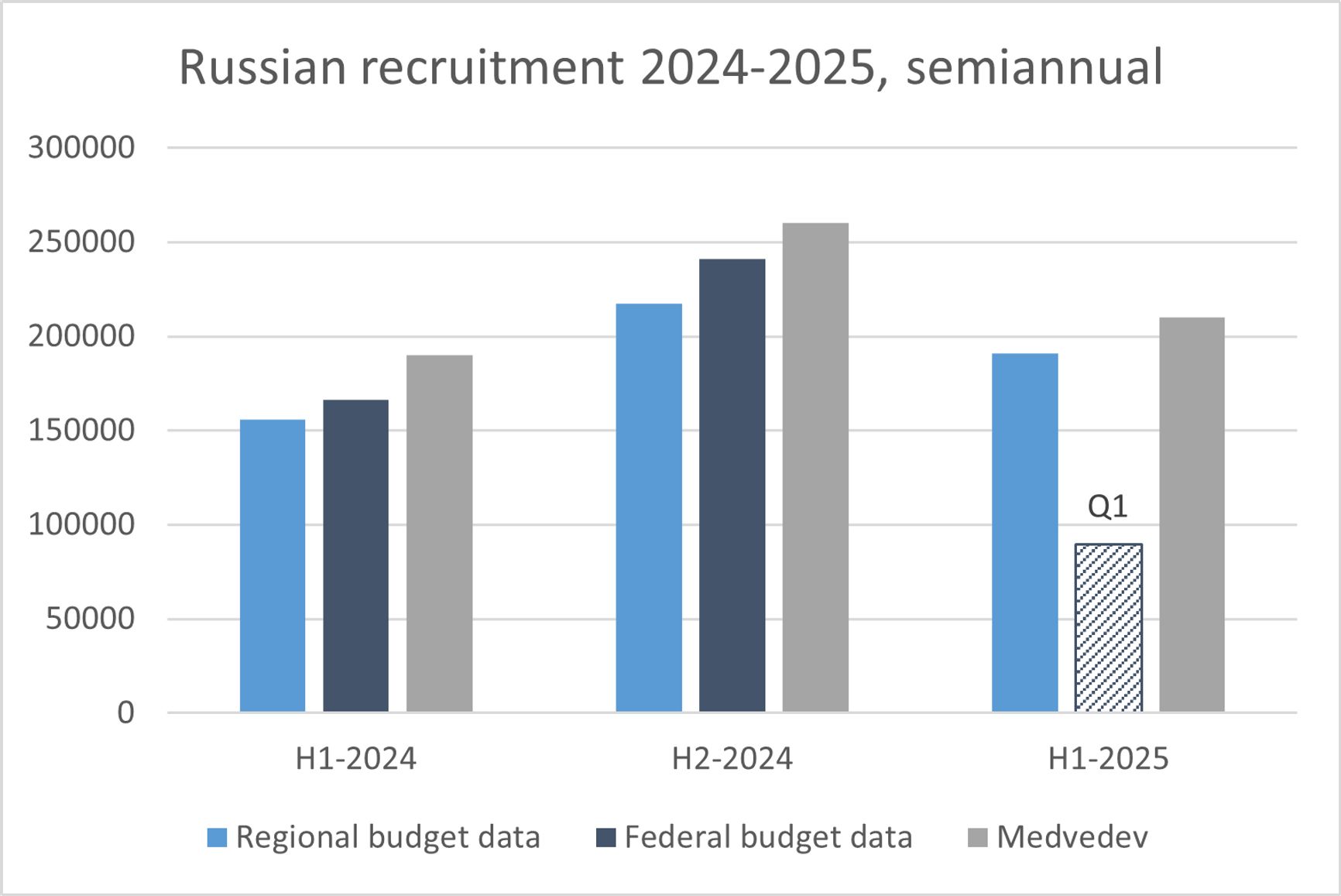 Научный сотрудник Немецкого института международных отношений и безопасности (SWP) Янис Клюге оценил темп заключения контрактов с Минобороны РФ в первой половине 2025 года. Согласно недавнему заявлению Дмитрия Медведева, за этот период было подписано около 210 тысяч контрактов, что на 10% больше, чем за аналогичный период 2024 года. Цифры Медведева обычно немного выше оценок, основанных на расходах региональных и федеральных бюджетов на выплаты контрактникам, и первая половина 2025 года, похоже, не стала исключением. Согласно данным региональных бюджетов, за последние шесть месяцев была подписана 191 тысяча контрактов.