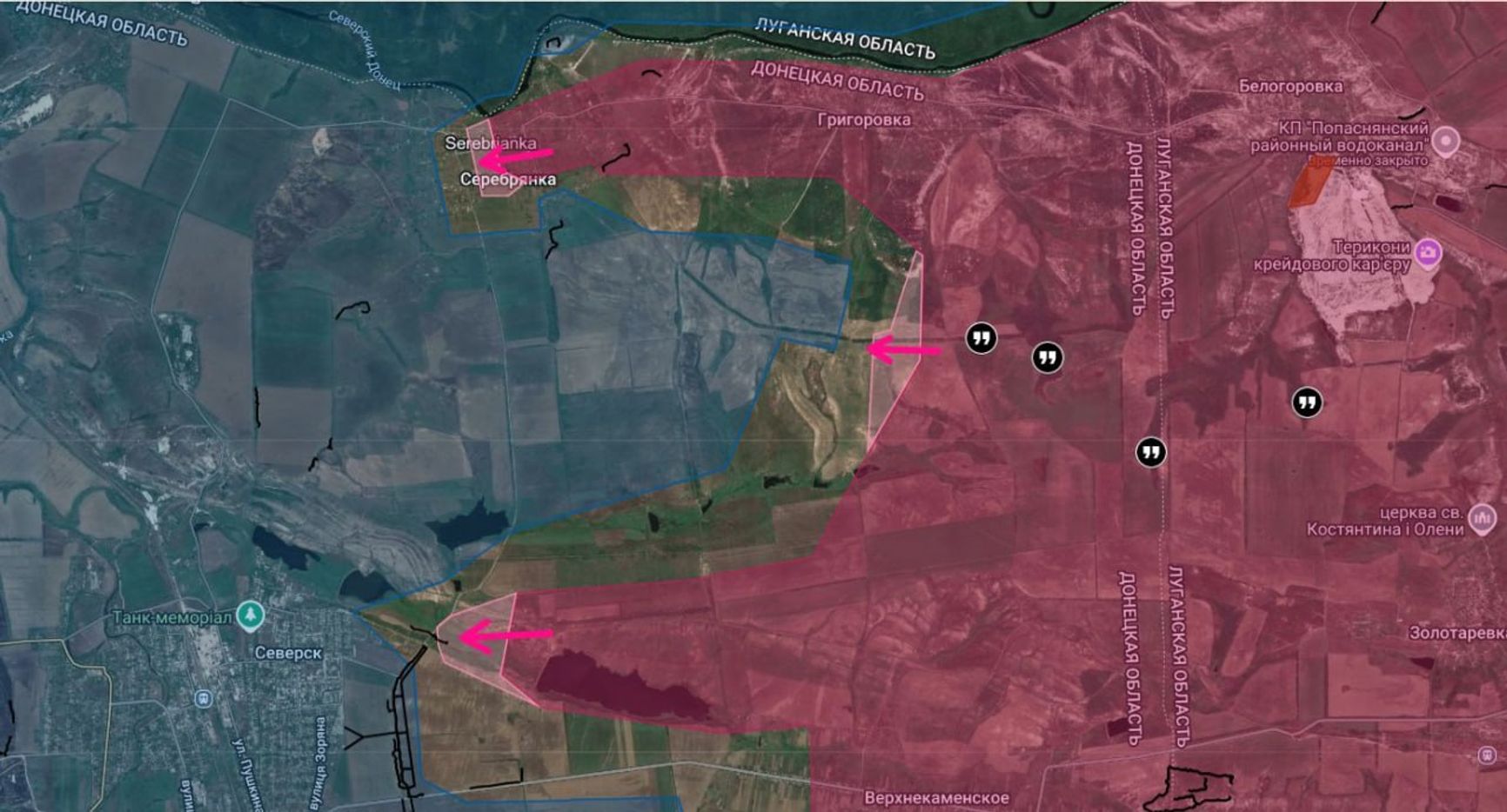 Анатолий Радов сообщает, что ВС РФ удалось взять под контроль половину Серебрянки и продвинуться к северо-восточной окраине Северска. Юрий Котенок также сообщает о наступлении на Северск и Серебрянку, отмечая, что украинские части на направлении проводят контратаки, а в Серебрянке основной рубеж обороны СОУ проходит по высотам западнее села, что затрудняет российские действия в населенном пункте.