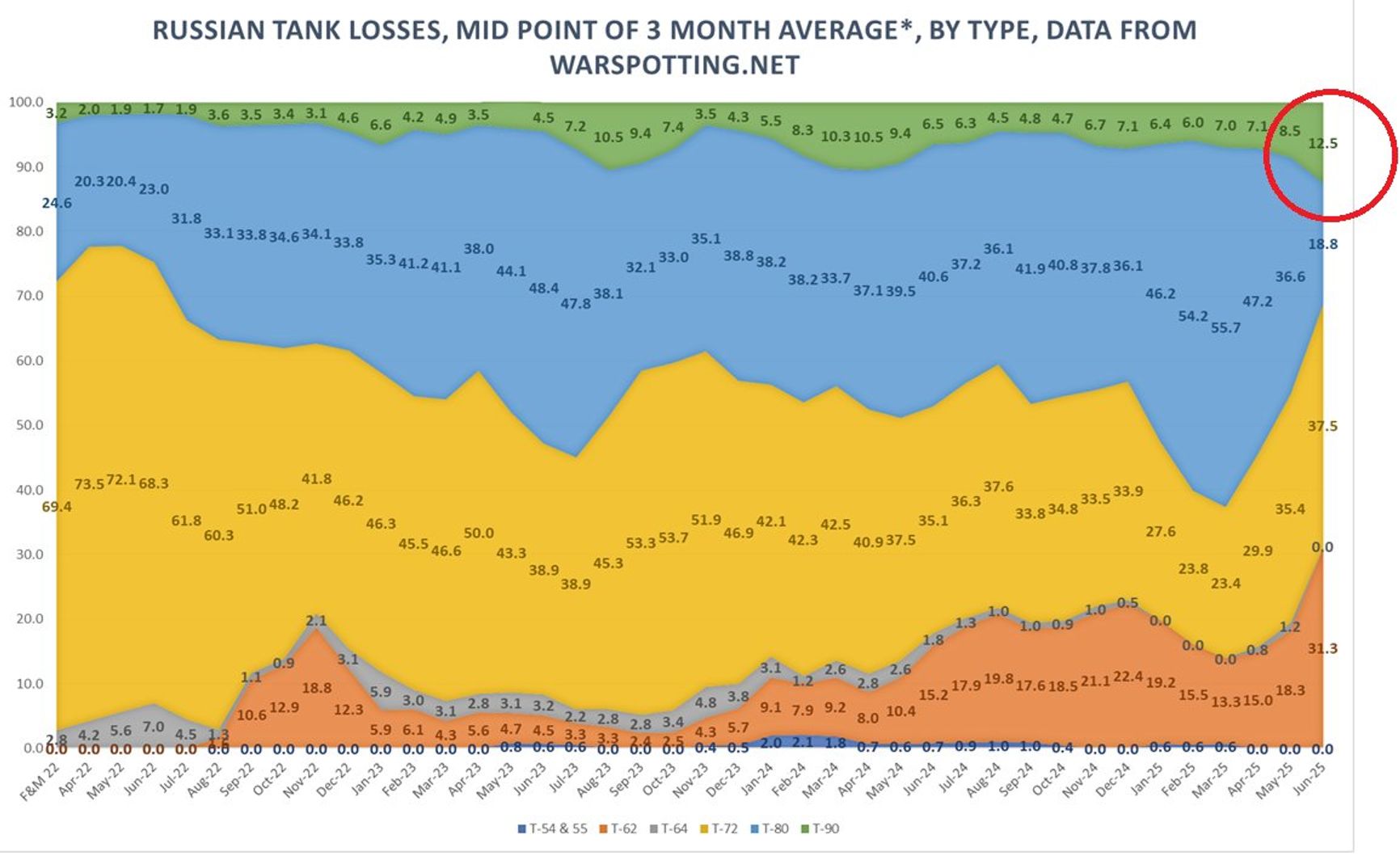 OSINT-исследователь Ричард Верекер обновил графики потерь российских танков. Он предупреждает, что говорить о каких-либо тенденциях сложно из-за маленькой выборки (потери танков в июне составили всего 17 единиц). Практически сошли на нет потери Т-72 старых модификаций, уступив место модернизированным Т-72Б3 образца 2022 года. Точно так же большинство потерь Т-80 теперь составляют Т-80БВ / БВМ образца 2022 года. Соотношение потерь танков и БМП держится на уровне 3:1, что существенно больше, чем в течение большей части полномасштабной войны, когда этот показатель был ближе к 2:1.