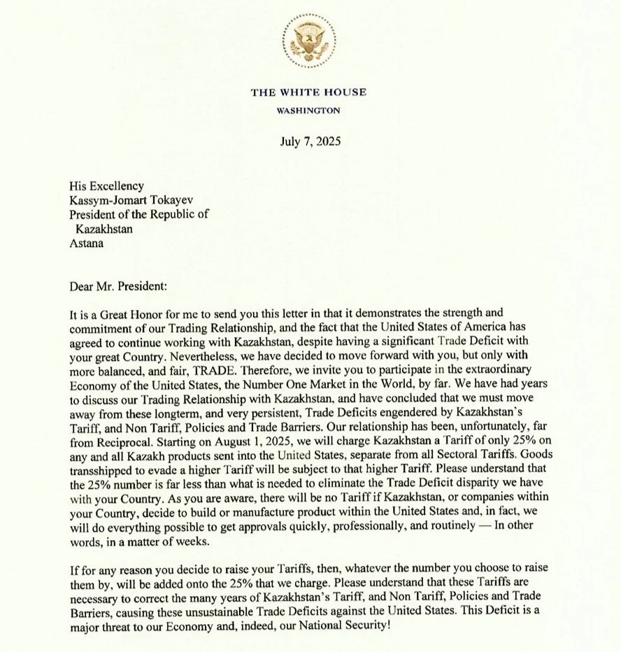 «Дорогой господин Президент! Это большая честь для меня…» — начинает письмо Трамп. Он заявляет, что для установление честной торговли между США и Казахстаном настало время ликвидировать многолетний торговый дефицит — для чего США в одностороннем порядке вводят против всех казахских товаров тариф — «всего 25%». Этот тариф не заменяет секторальные тарифы на особые категории товаров, которые действуют отдельно.
