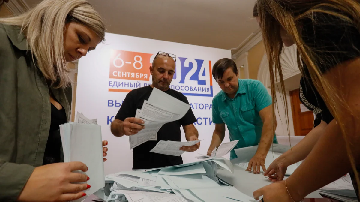 Члены избирательной комиссии подсчитывают голоса бюллетени в Курске, 8 сентября 2024 года. Фото: EPA