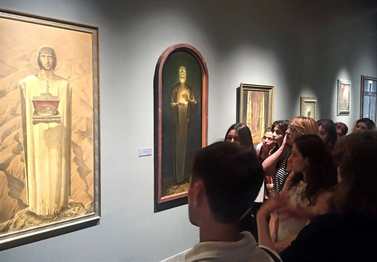 А вот и подпомоговский «Комитас». Не просто композитор, а сердце армянской культуры. «Мы не знаем, как это удалось художнику, но даже когда в зале полностью темно, свет, который несет «Комитас», работает так, будто внутри горит лампа. Мы даже думали не ставить свет возле этой картины, потому что она ярко светится изнутри», — комментирует экспонат Армен Есаянц.