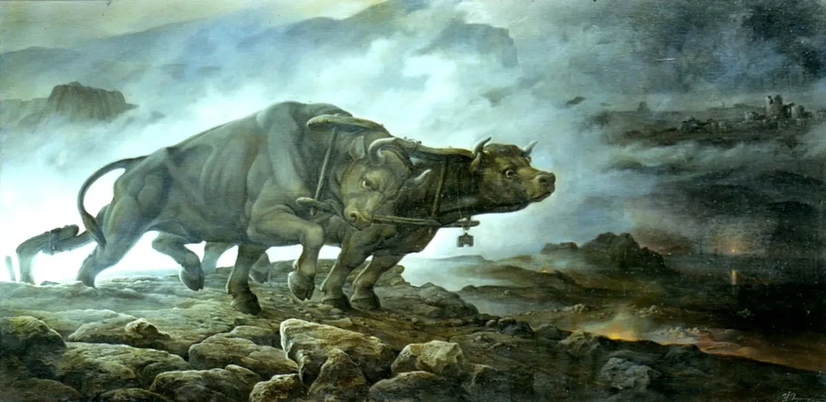 Одна из любимых и самых пронзительных картин мастера — «Страна Айастан»: два быка напряженно, с титаническим усилием тянут плуг, пытаясь вспахать голые камни. Это — символ Армении.