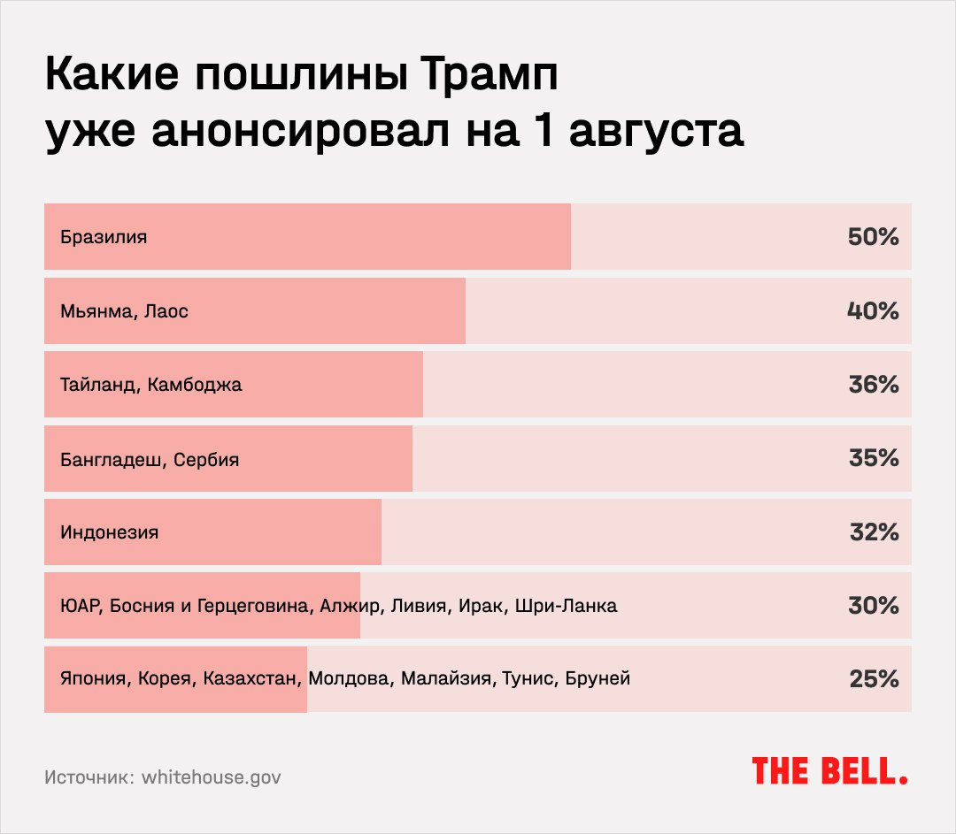 - Дополнительно 9 июля Трамп объявил пошлины в 30 % на импорт из Алжира, Ливии, Ирака и Шри‑Ланки; также 25 % — для Брунея и Молдавии, и 20 % — для Филиппин.