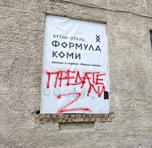 Здание в Сыктывкаре, где располагается культурное пространство «Револьт-центр» — куда во вторник пришли с обысками по делу о госизмене в отношении сооснователя организации Павла Андреева* — атаковали Z-активисты, хотя центр был закрыт.