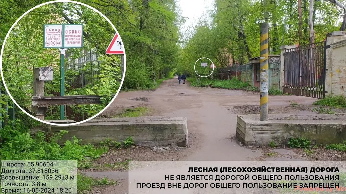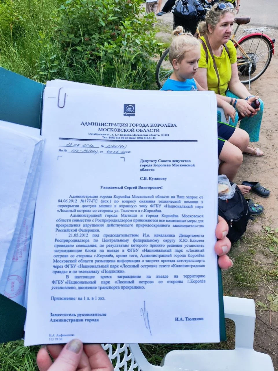 Подписи уже начали собирать — в прокуратуру и куда-то еще. На пятачке собралось уже много народа, приехали люди из Мытищ и Щелкова — вдоль ограды парка все уставлено велосипедами. Мы разговорились с жительницей поселка Натальей и ее подругой, в руках у них папки с документами. Они рассказали, что заграждающие блоки на границе между Финским поселком и участком национального парка «Лосиный остров» были установлены по решению властей в 2012 году. Тогда в час пик мимо поселка потоком шли автомобили, объезжая пробку на Ярославке: за мостом через Яузу съезжали на Водопроводную аллею, затем поворачивали в «Лосиный остров», у шлагбаума платили 100 руб. за проезд на охраняемую территорию и через несколько километров въезжали в Королев возле цветочного хозяйства.