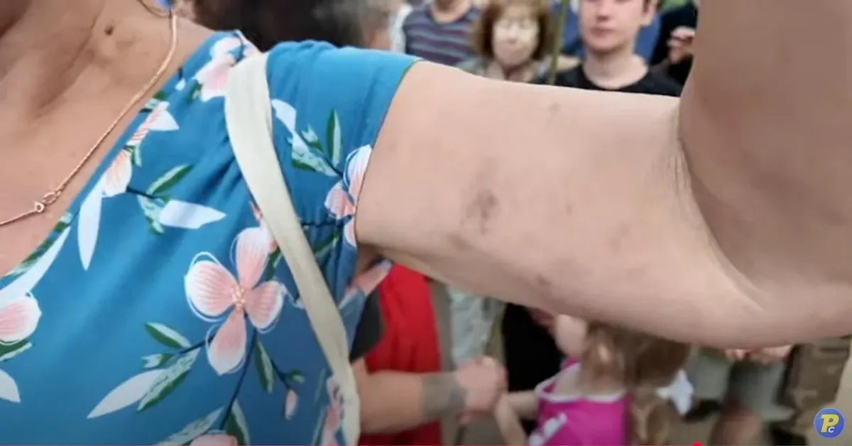 — Я у него спросила, почему он у тех не берет показания, а он сказал, что у них показания возьмут другие люди, — передает Ирина свой разговор с полицейским. Она одета в голубое платье в цветочек, без рукавов, обе руки в царапинах, видно, что на них начинают проступать синяки. Она вынуждена обратиться за медпомощью.