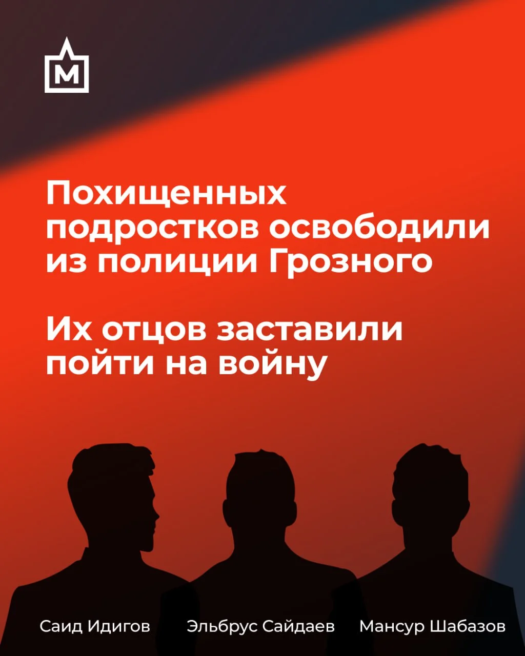 Силовики в Чечне освободили похищенных более шести месяцев назад подростков Саида Идигова, Эльбруса Сайдаева и Мансура Шабазова, а их отцов заставили подписать контракты с Минобороны РФ. Об этом сообщает «Мемориал».
