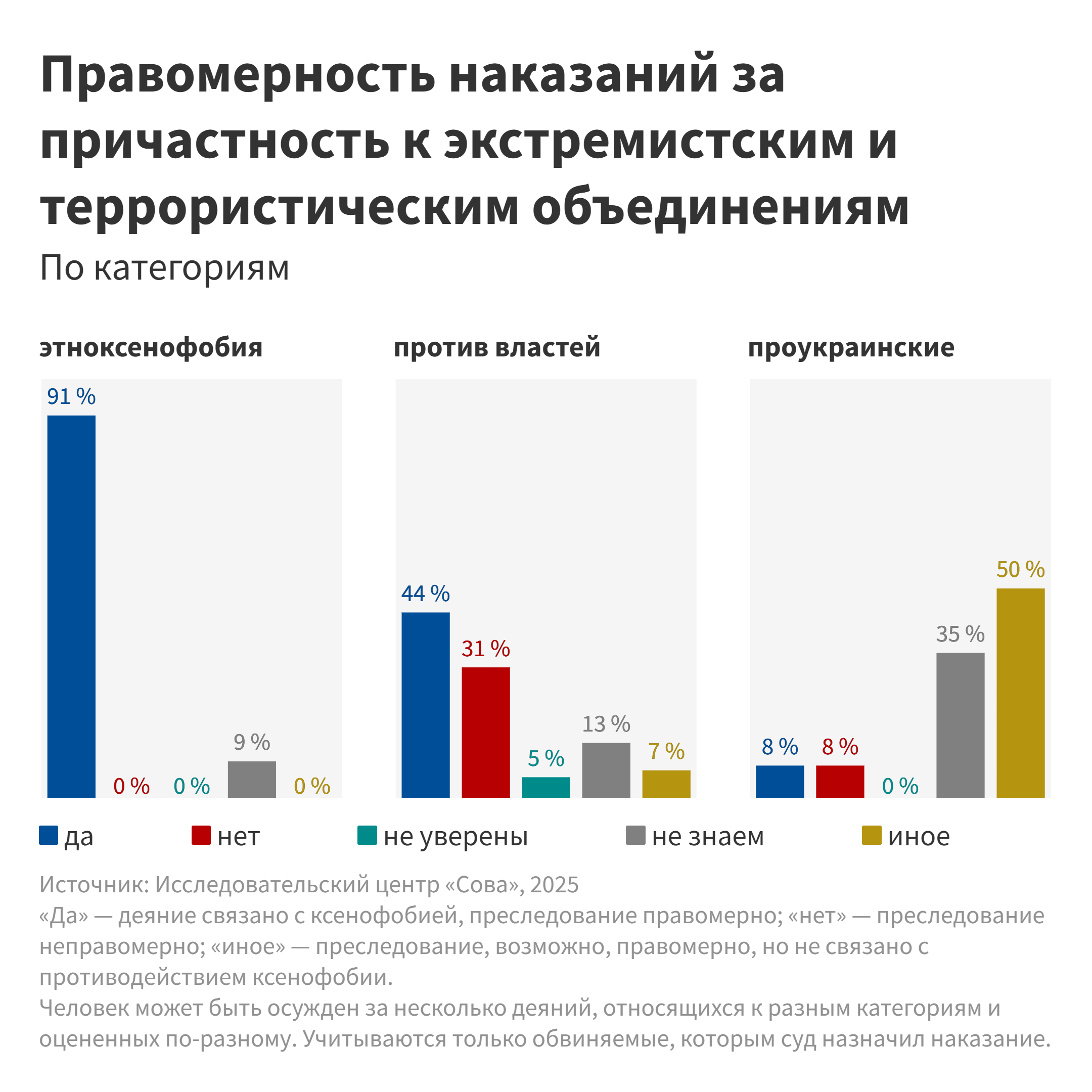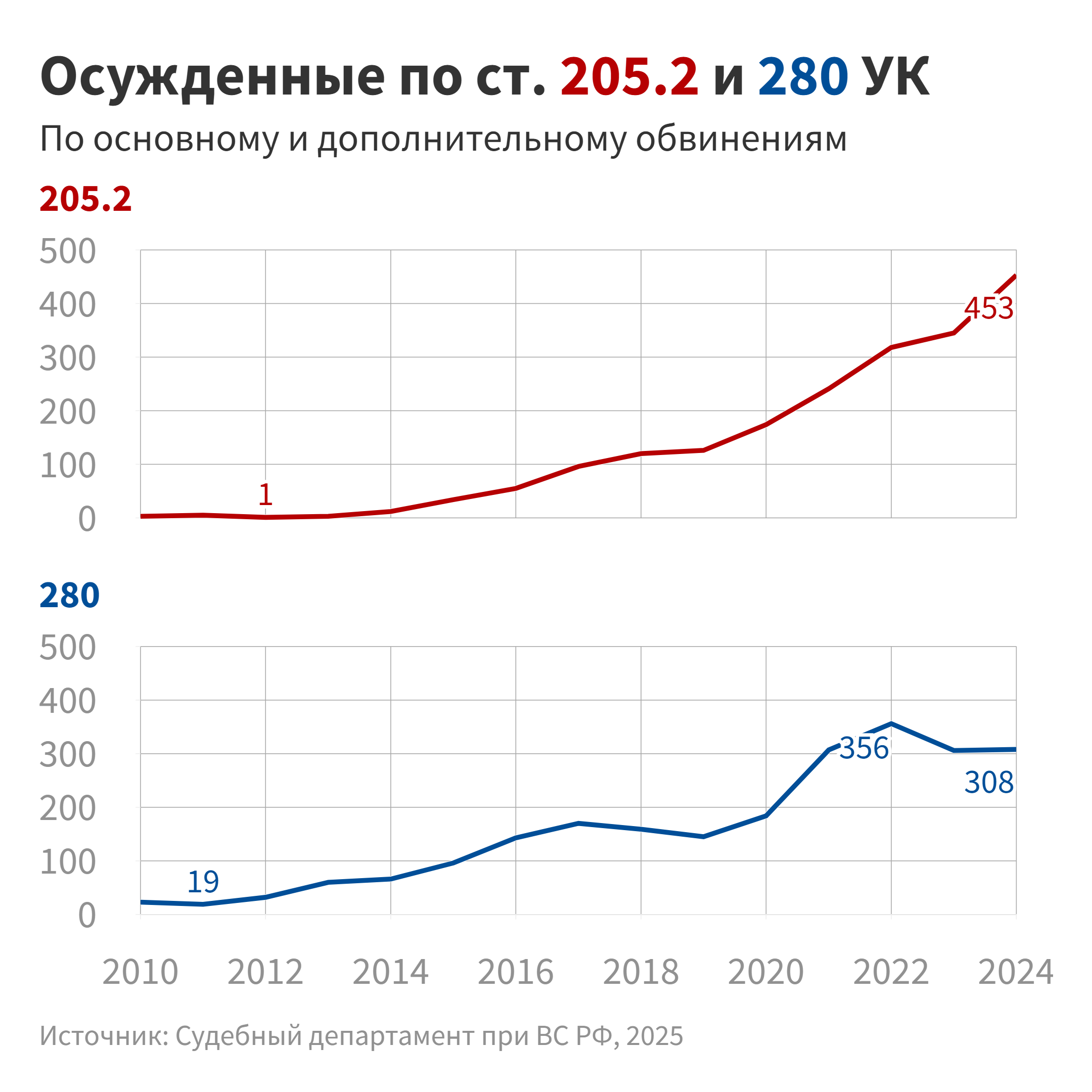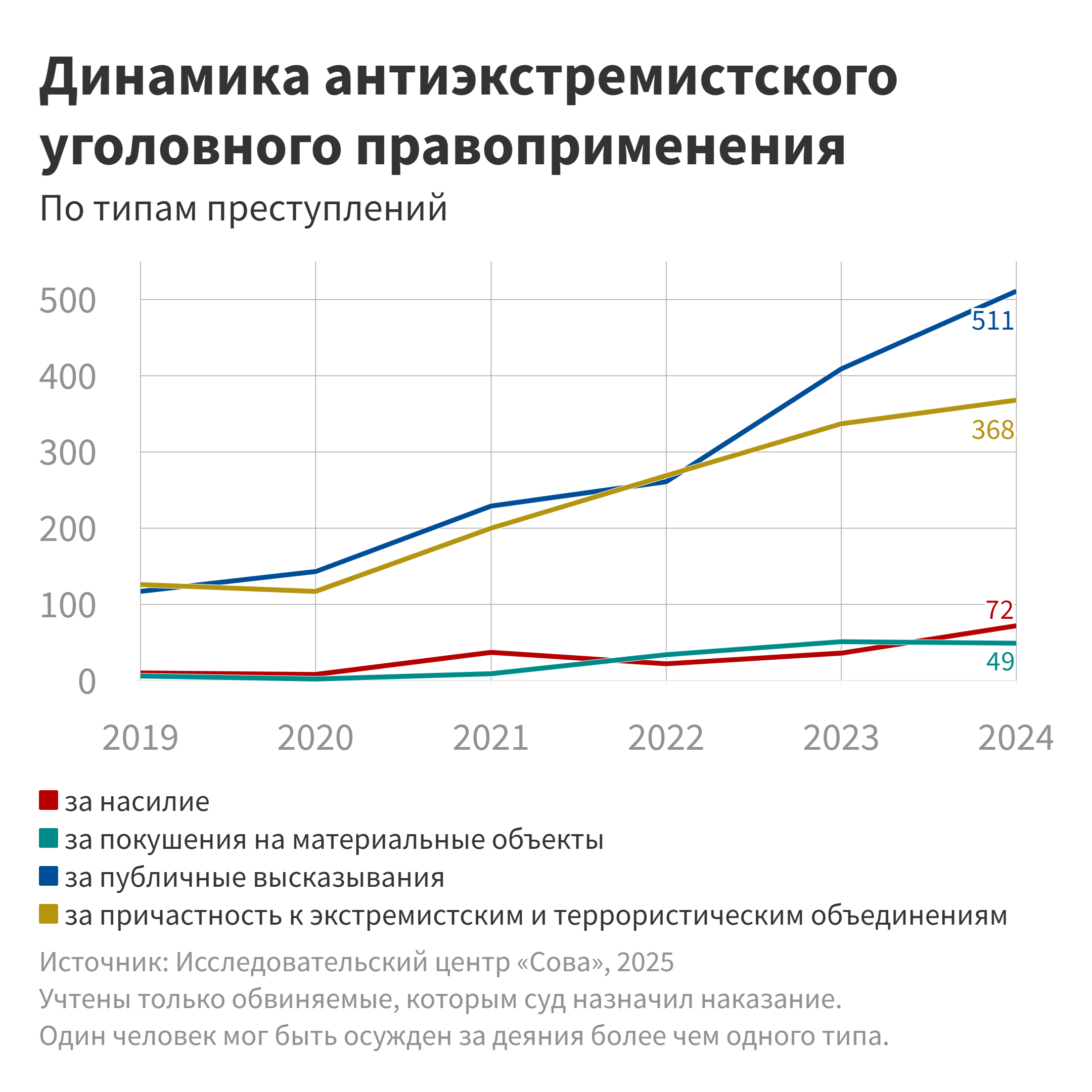 Наши данные существенно неполны, поэтому точных сведений о числе привлеченных к ответственности за публичные высказывания и причастность к экстремистским и террористическим объединениям у нас нет и мы можем только предположить, что в 2025 году прирост осужденных окажется меньше, чем в 2024-м.