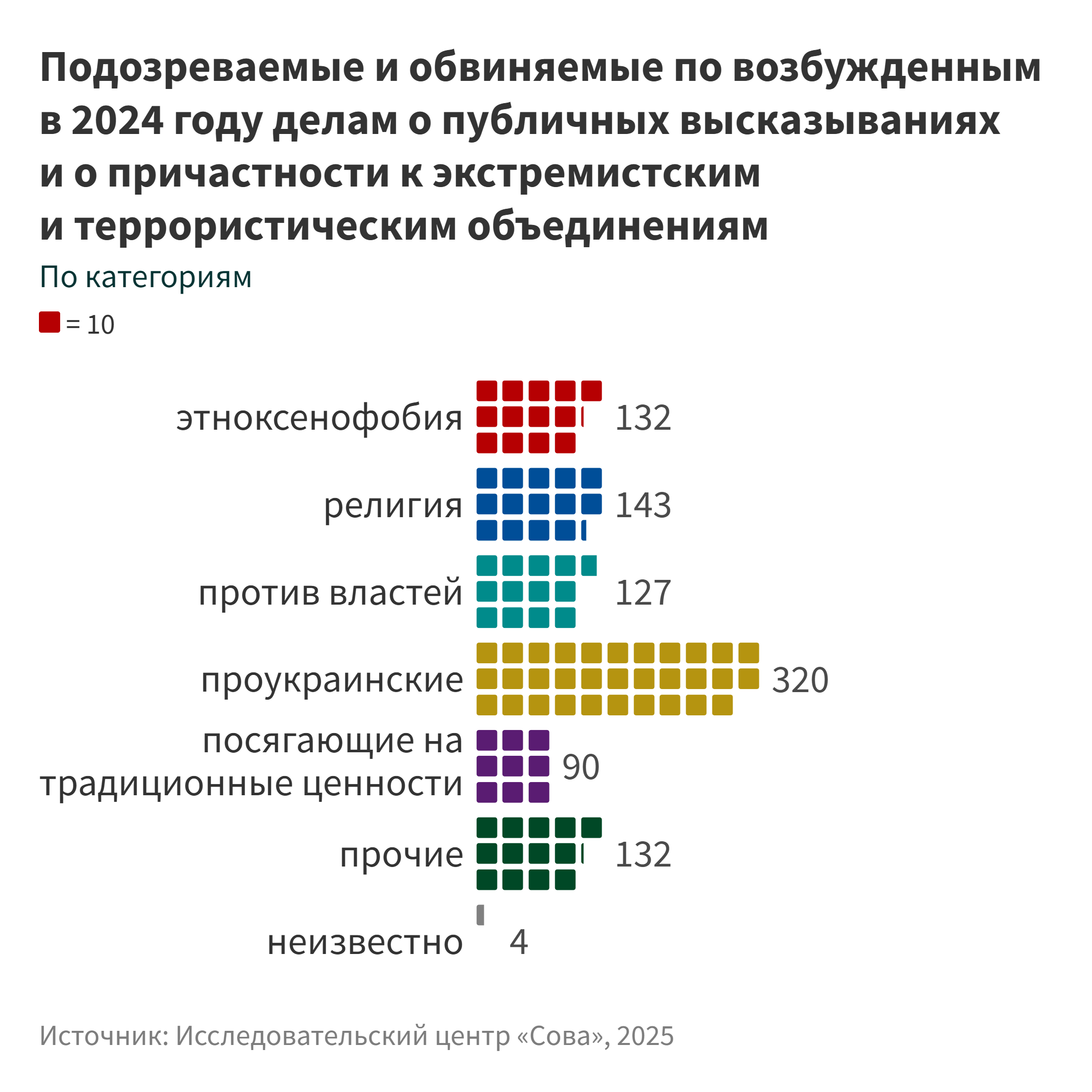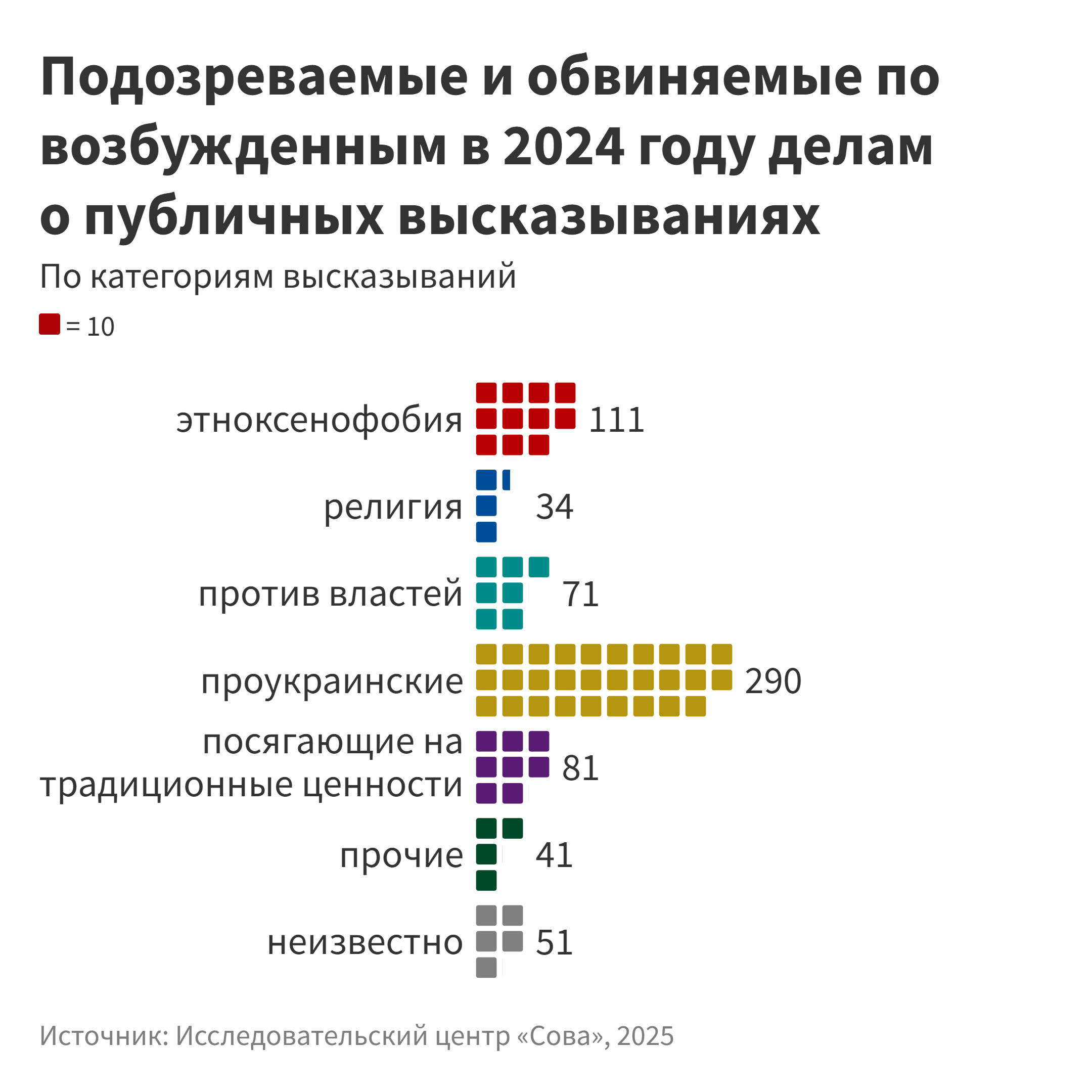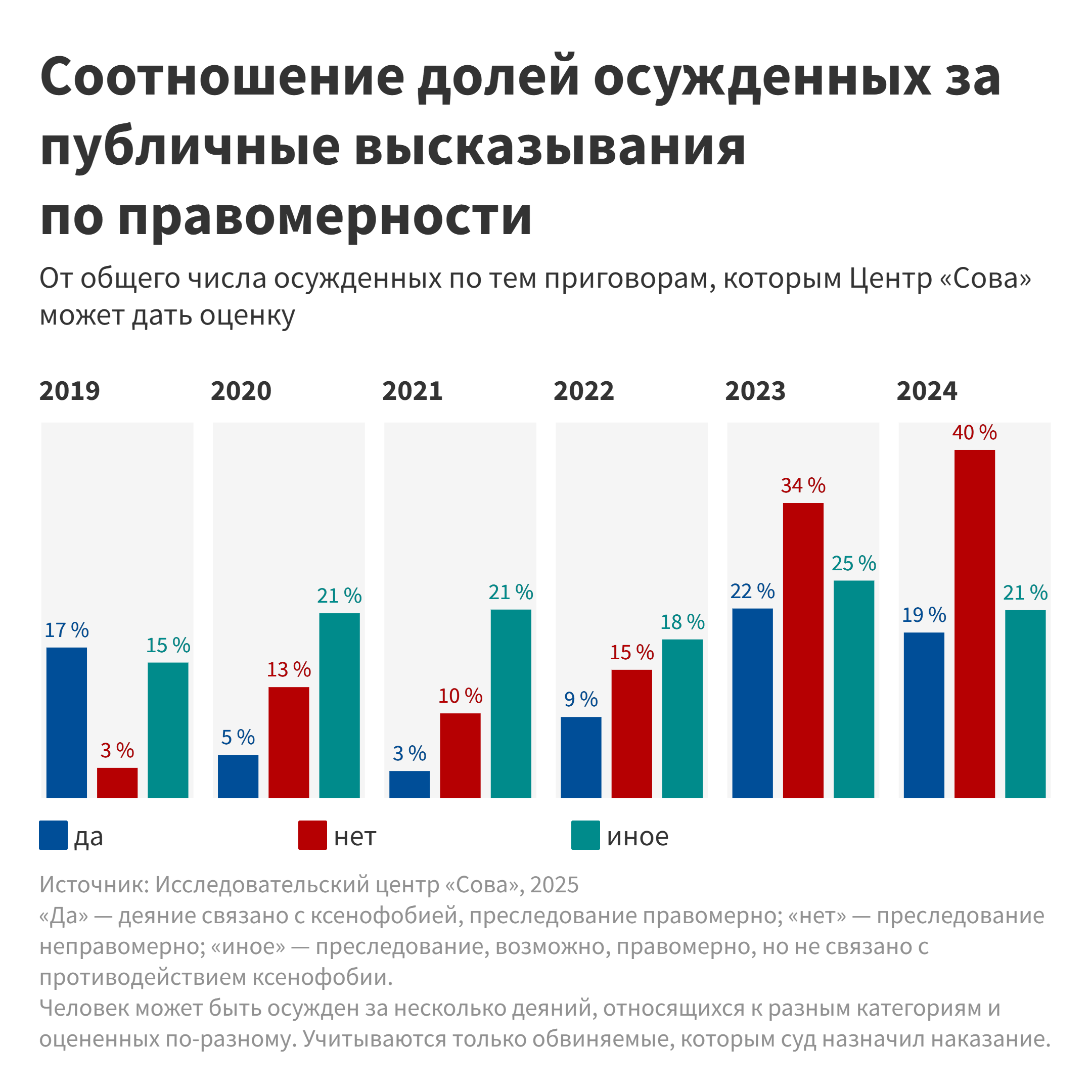 [18] Отметим, что 19 осужденных по чч. 3 и 4 ст. 3541 УК, на наш взгляд, наказаны за деяния, которые можно расценить как вандализм, поэтому ниже мы не будем учитывать вынесенные им приговоры при подсчете общего числа осужденных за высказывания в 2024 году.