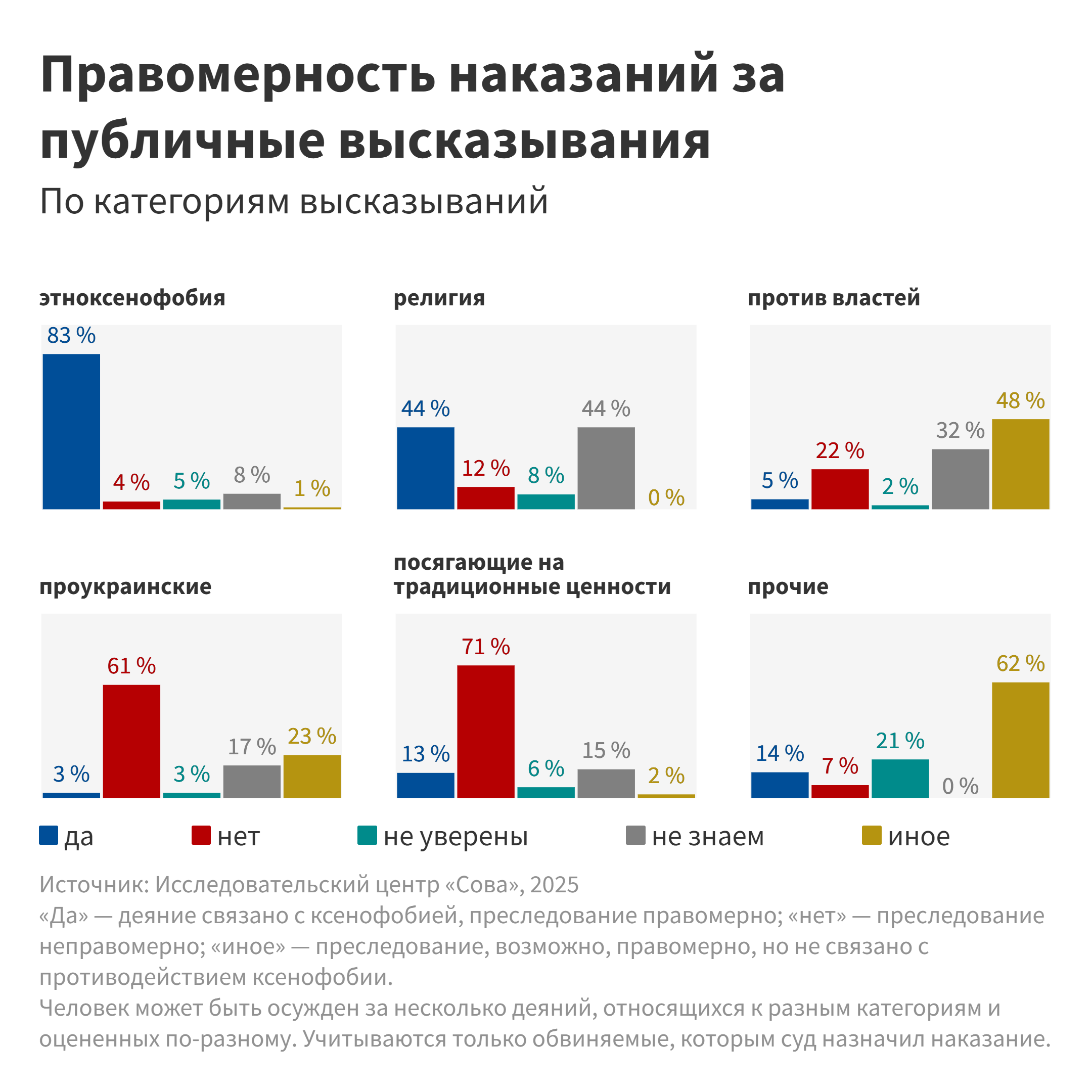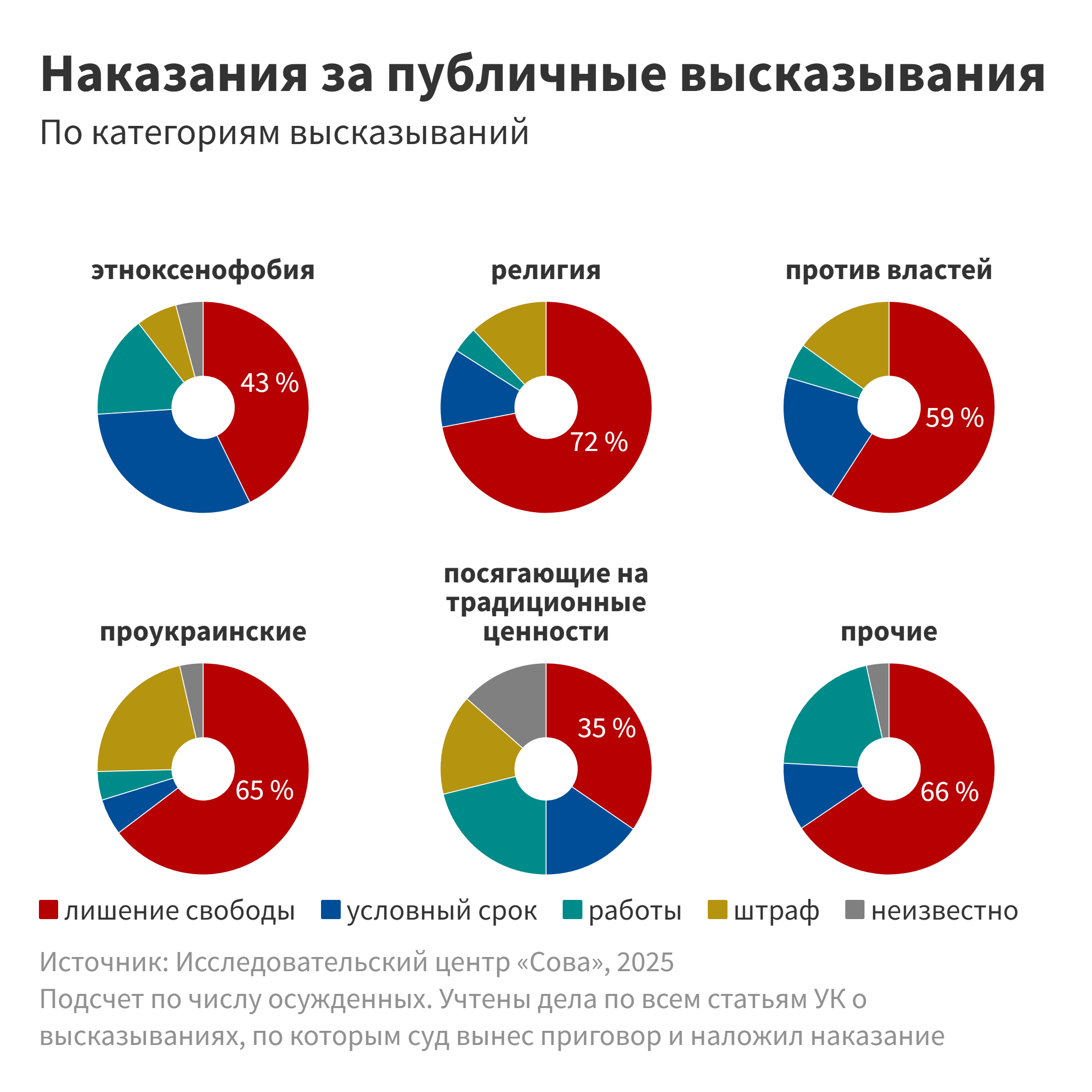 Кроме того, мы распределим приговоры по каждой из статей в зависимости от характера публичных высказываний, послуживших поводом для преследования, между следующими условными категориями: