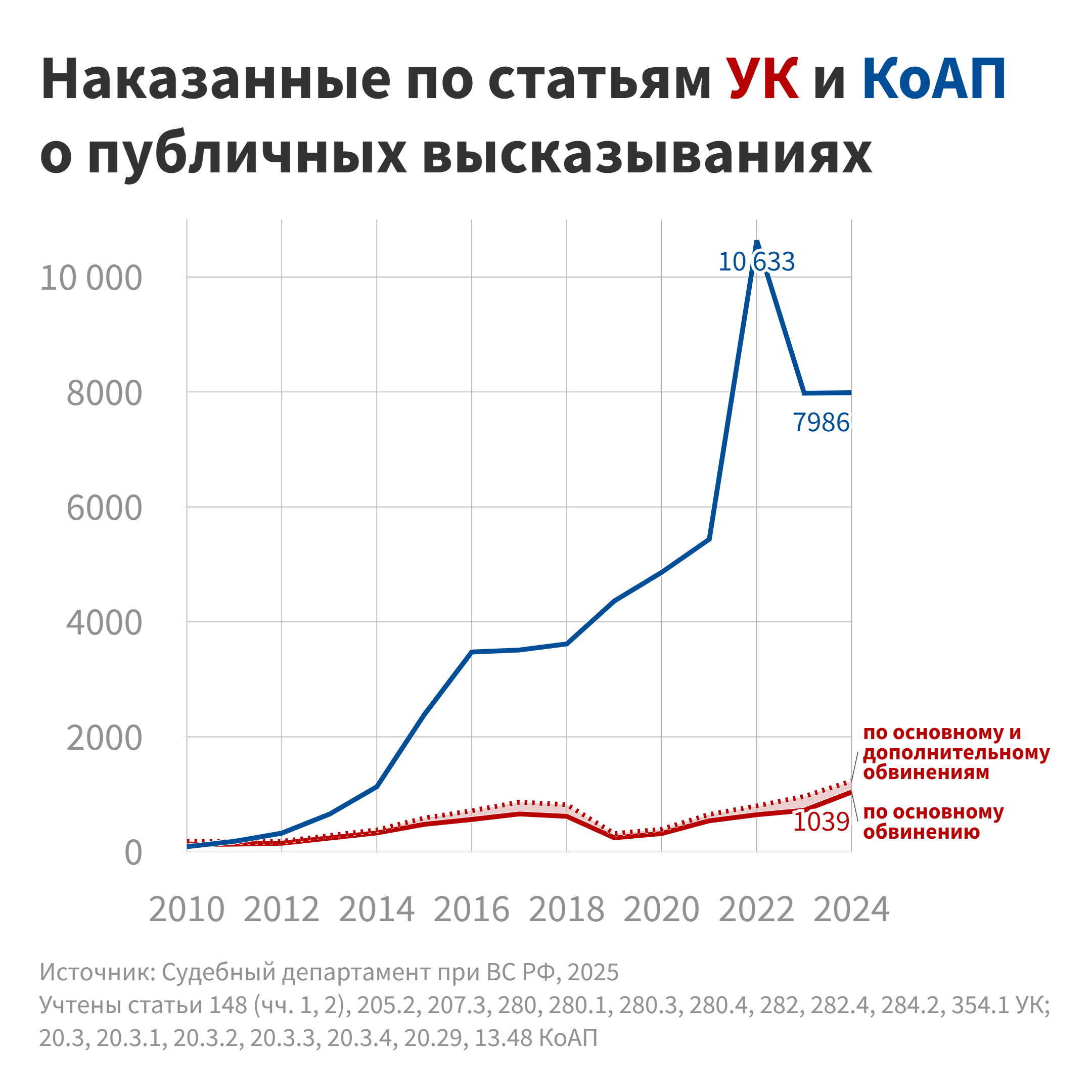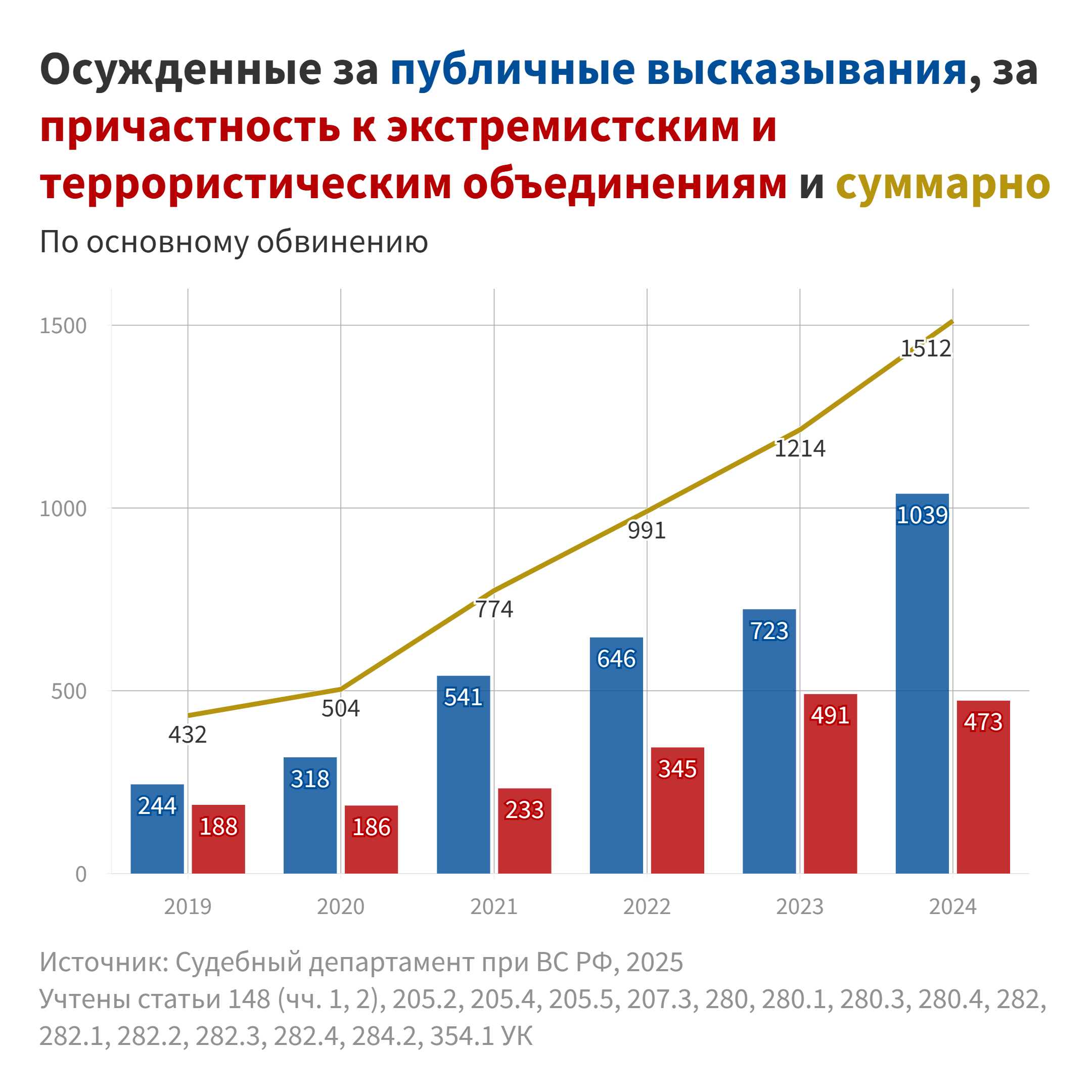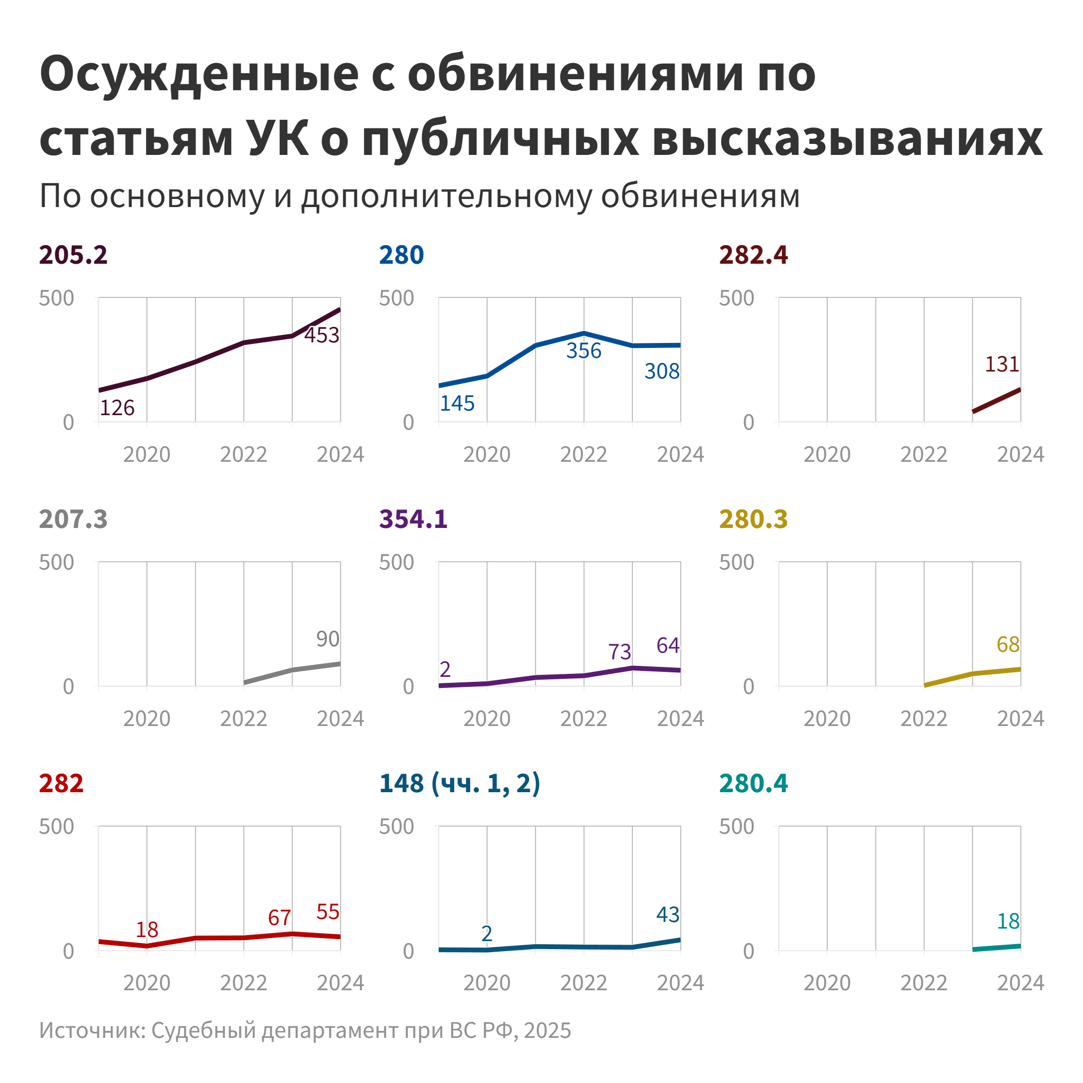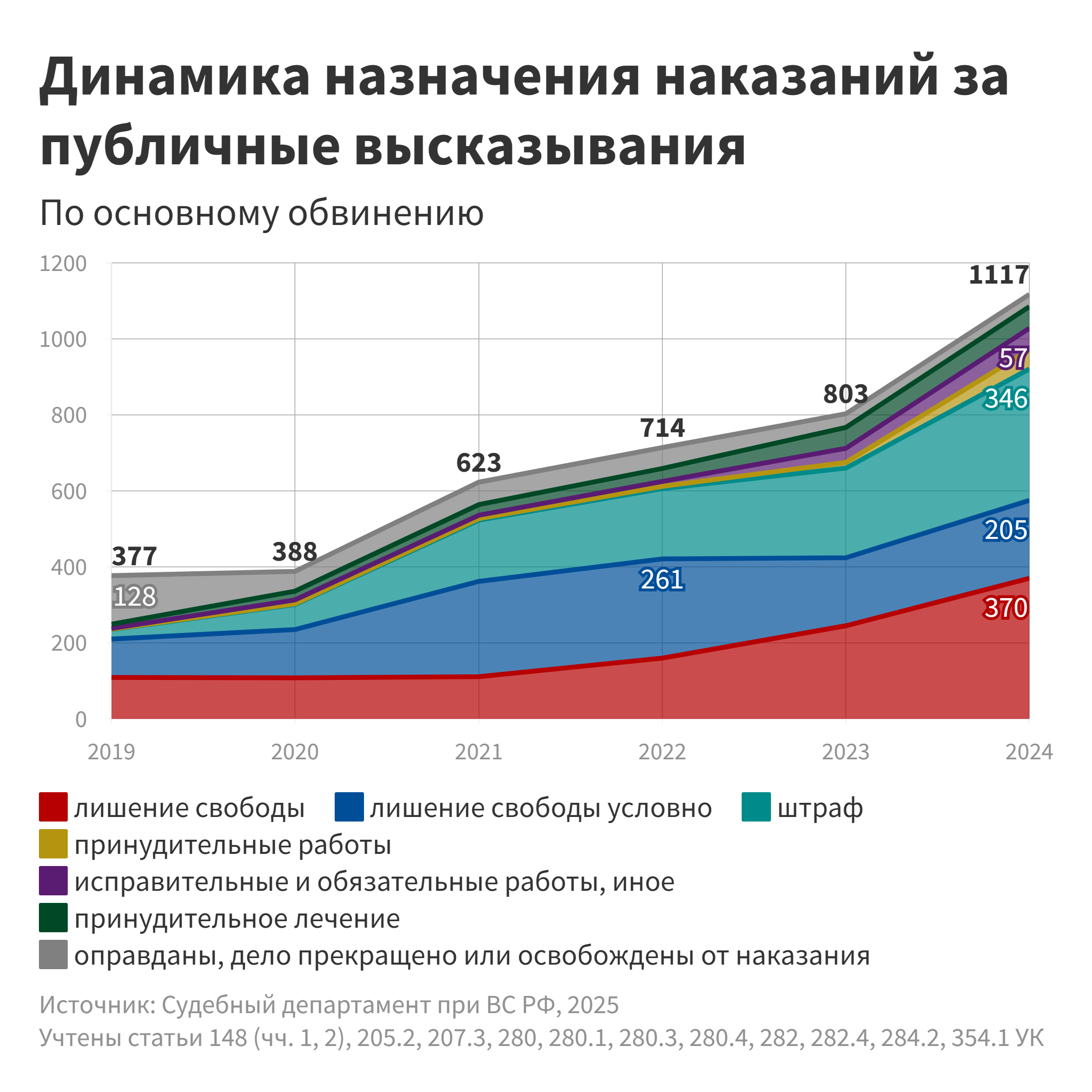В части, посвященной статьям УК о публичных высказываниях, будет приведен анализ статистических данных для каждой релевантной статьи – начиная с наиболее часто применявшихся и далее в порядке убывания количества приговоров в 2024 году, с вкраплениями близких к ним норм, применявшихся в единичных случаях.