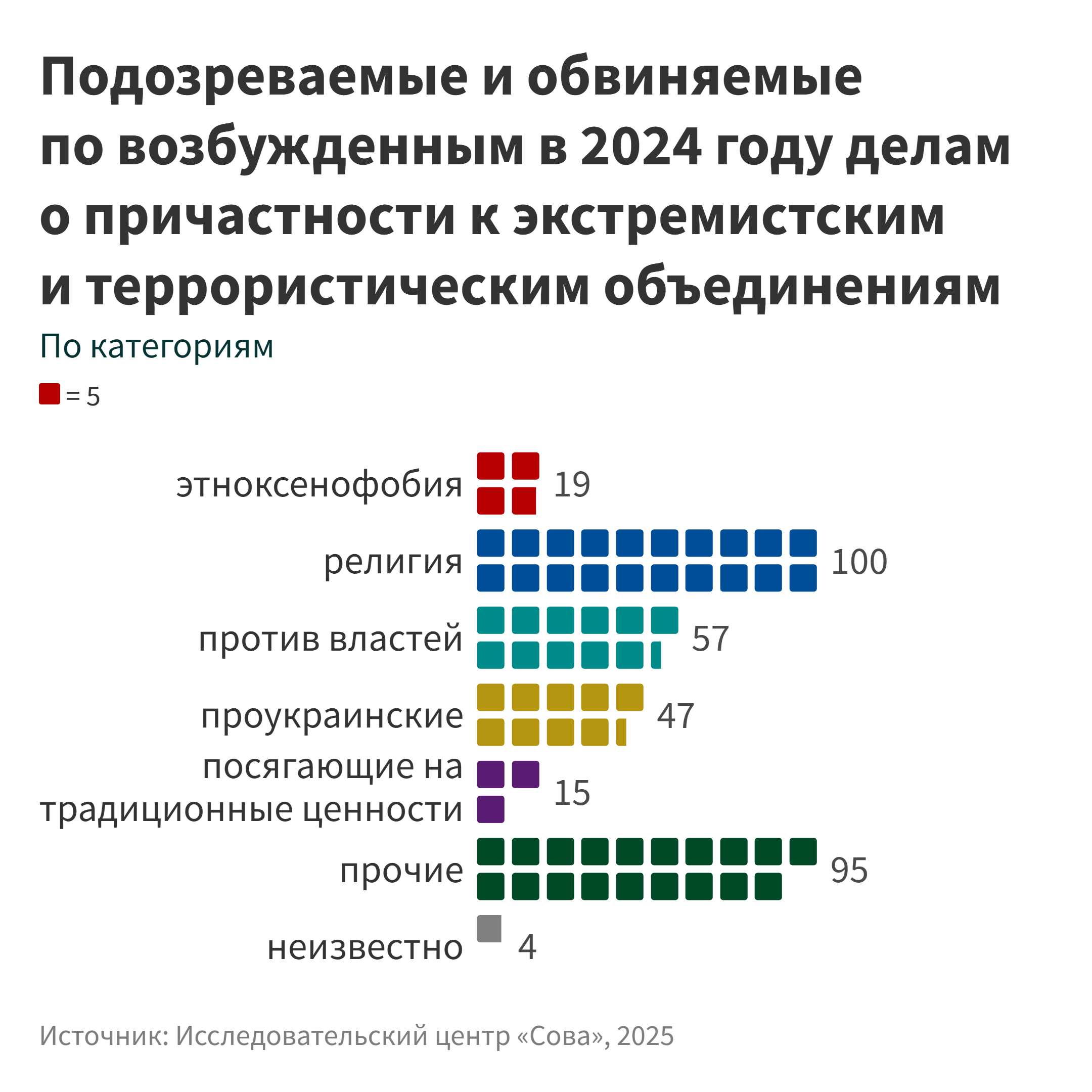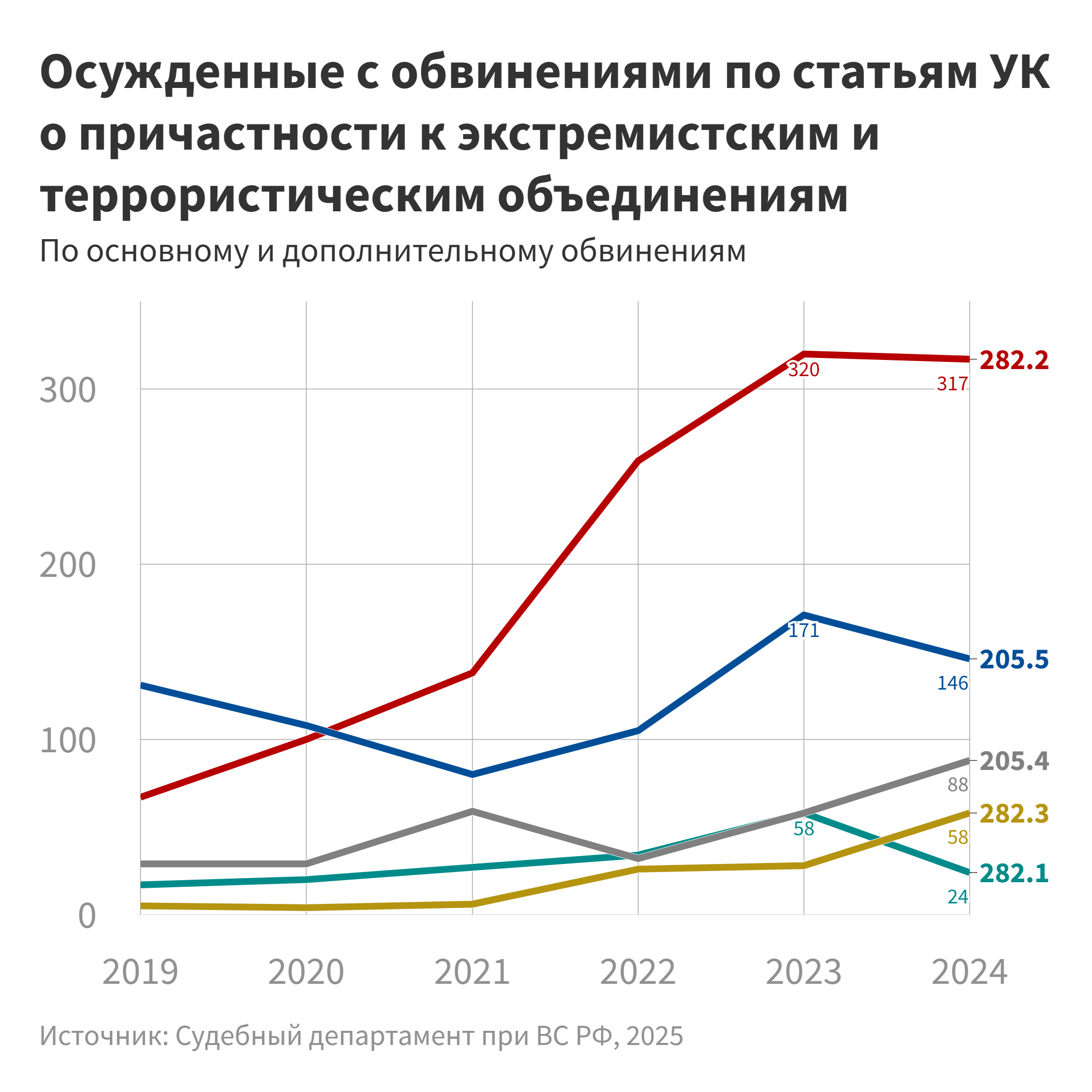 Что касается причастности к запрещенным объединениям, то, основываясь на данных судебного департамента при Верховном суде об осужденных по соответствующим статьям УК, можно заключить, что после четырех лет ежегодного прироста в 2024 году их число снизилось на 4 % по сравнению с предшествующим годом.
