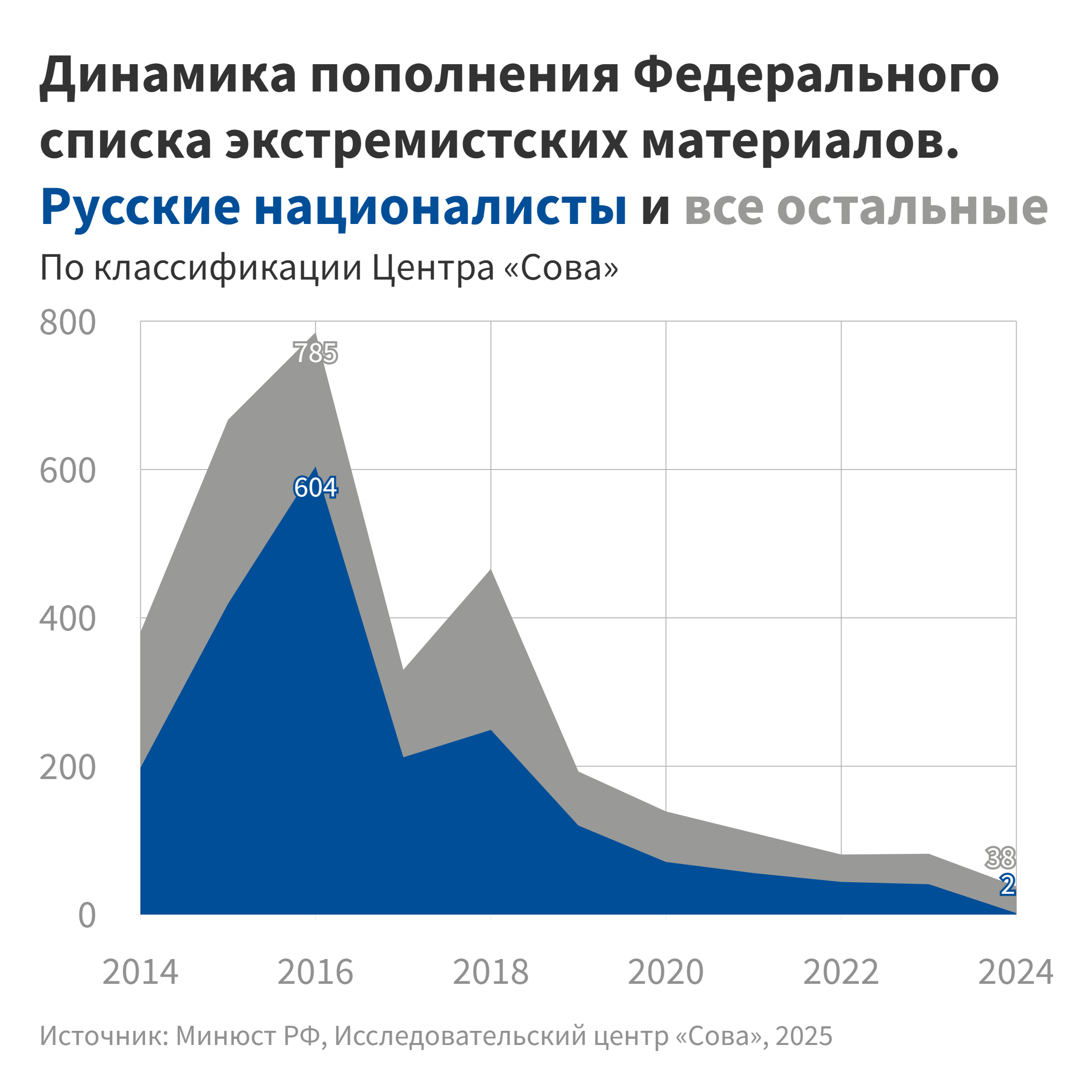 В 2024 году темп пополнения Федерального списка экстремистских материалов (ФСЭМ) снизился по сравнению с предыдущим годом более, чем в два раза: список обновился 18 раз, в него было добавлено 38 пунктов (годом ранее – 82)[35]. К концу 2024 года в списке значилось 5454 пункта (а к 1 июля 2025 года – 5470). Отметим, что ежегодный прирост списка падает с 2018 года, и это, видимо, свидетельствует о том, что власти осознают неэффективность ФСЭМ как механизма борьбы с экстремизмом.