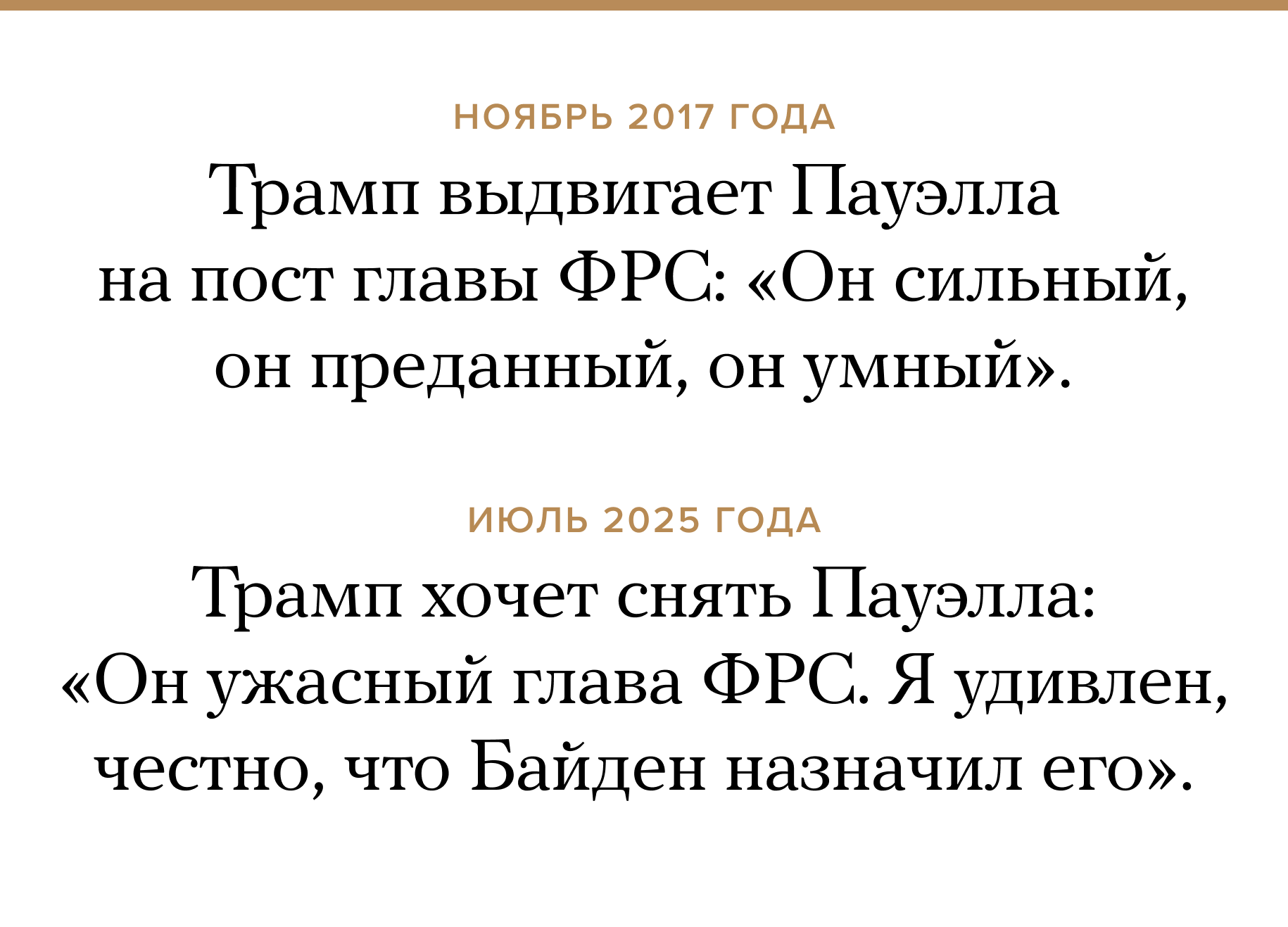 Президент США Дональд Трамп подверг критике своего предшественника Джо Байдена за назначение Джерома Пауэлла главой Федеральной резервной системы США. Трамп сказал, что «был удивлен, что Байден назначил его, а потом продлил срок его полномочий». Однако кандидатуру Пауэлла на утверждение в сенат внес сам Трамп — во время своего первого президентского срока в 2017 году (при этом в 2021 году Байден действительно продлил полномочия Пауэлла). Разногласия у Трампа с Пауэллом возникли сразу после назначения, так как глава ФРС не стал понижать процентные ставки, как хотел президент. Летом 2025 года старый конфликт обострился — агентство Bloomberg написало, что Трамп показал конгрессменам черновик письма об увольнении Пауэлла. Основанием для этого (президент не имеет права уволить главу ФРС просто так) могли быть обвинения в растрате из-за слишком «шикарного» ремонта здания ведомства. Доллар на рынках резко упал, после чего президент подчеркнул, что без реальных доказательств увольнение «крайне маловероятно».