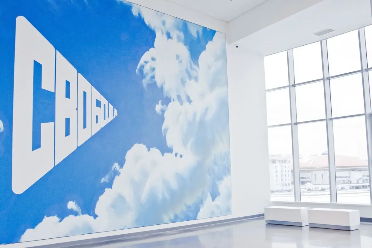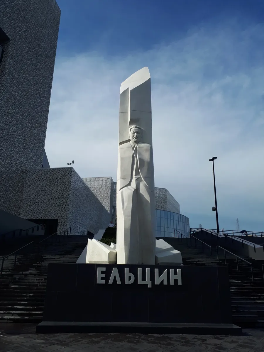 …Обычная экскурсия в музее Ельцина начинается с анимированного фильма, иллюстрирующего долгий (и не оконченный) путь России к свободе. Самое начало фильма повествует о том, как новгородское вече дважды изгоняло из города князя Александра Невского, а заканчивается экскурсия в большом зале, где обычно проходят конференции, а в стену вмонтирована до потолка картина Эрика Булатова: вид чистого неба, где меж облаков написано: «СВОБОДА».