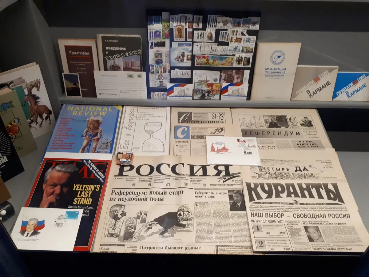 …Последний зал музея оказывается в определенном смысле и первым в истории Ельцин-центра (Президентского центра Б.Н. Ельцина). Сразу после отставки Ельцина его дочь Татьяна Дьяченко, бывший глава его администрации и будущий зять Валентин Юмашев и ближайшие сотрудники стали собирать архив для благотворительного фонда Б.Н. Ельцина, основанного в ноябре 2000 года.
