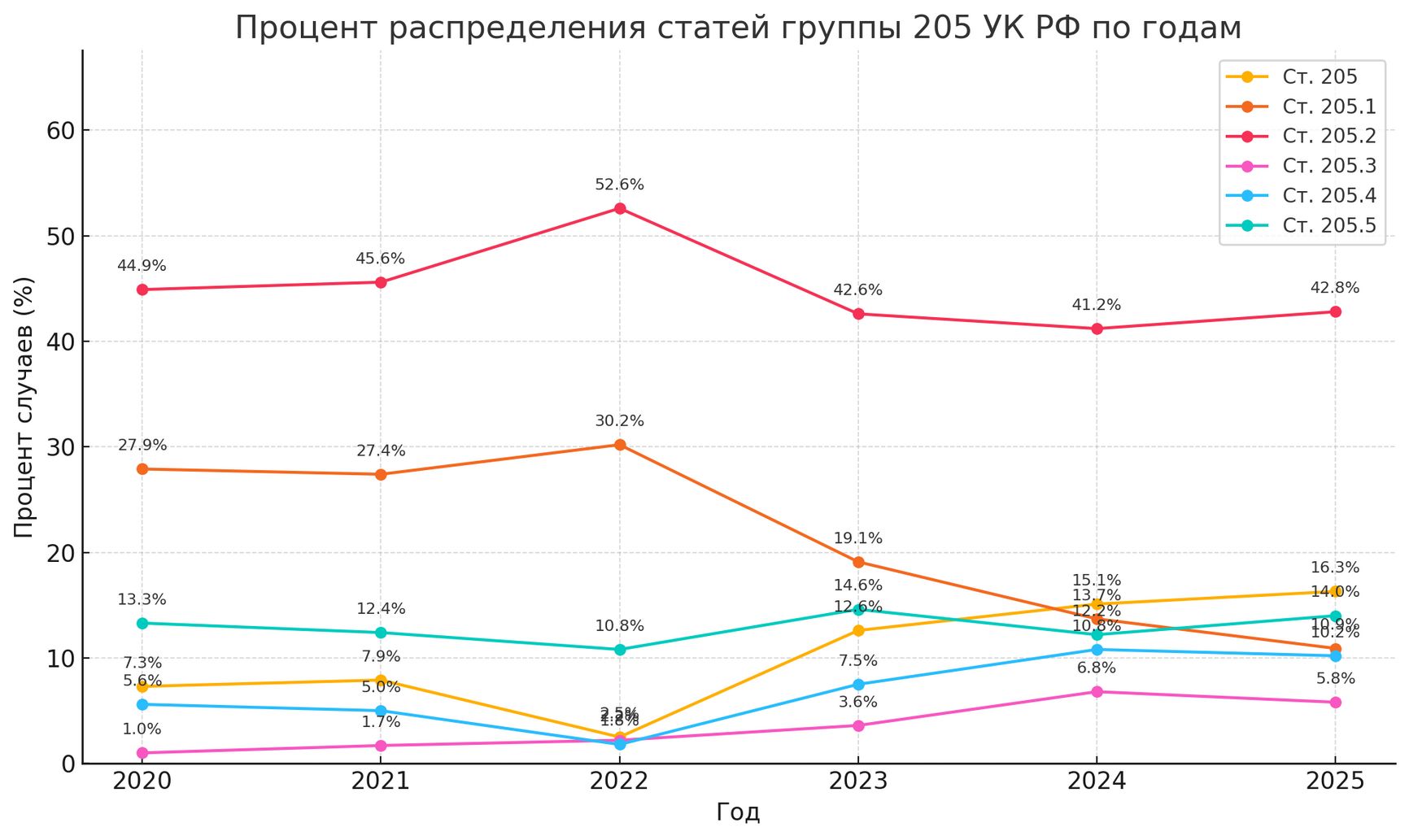 В приговорах судов стабильно доминирует «оправдание терроризма» (статья 205.2 УК РФ), но доля таких дел снижается. Так, в 2022 году их было больше половины (53%), а в 2025-м — около 42%. При этом резко растет применение статьи о террористическом акте (статья 205 УК РФ). В 2022 году доля этой статьи была всего 2,5%, а в 2025 году она выросла в 6,5 раз — до 16,3%. Также значительно растет доля статьи об организации террористического сообщества (статья 205.4 УК РФ).
