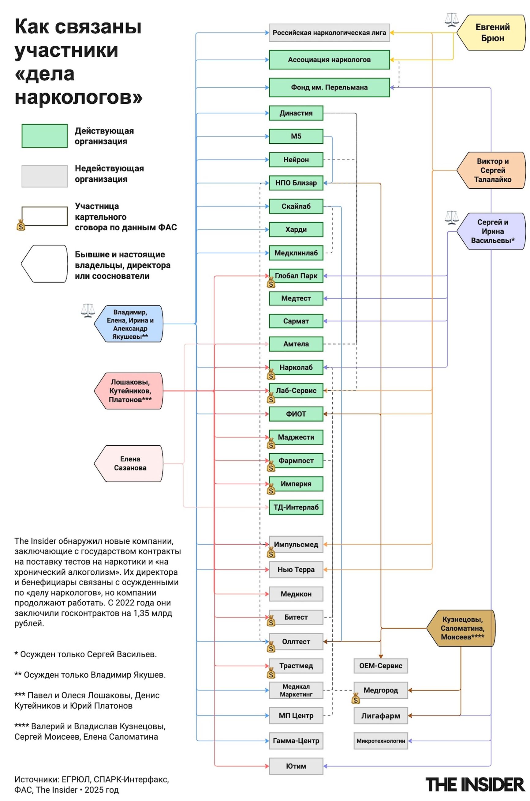 В конце мая Минздрав утвердил последнюю версию правил проверки школьников на наркотики — все достигшие 13 лет подростки раз в год должны будут проходить профилактический осмотр. Этот закон уже много лет лоббировал бывший главный нарколог Минздрава Евгений Брюн. Другая его идея — повальное тестирование водителей на алкоголизм — привела его в тюрьму: в октябре 2024 года Брюна, несмотря на преклонный возраст, приговорили к семи годам колонии, а также штрафу и лишению права работать в государственных органах. Компании, входившие в преступный картель, тем не менее продолжают вести бизнес: как подсчитал The Insider, с 2022 года они и новые юрлица с теми же бенефициарами заключили госконтрактов на 1,35 млрд рублей. The Insider рассказывает, как советский нарколог пришел к идее заработка на тест-системах, параллельно построив в России одну из самых репрессивных наркополитик в мире.
